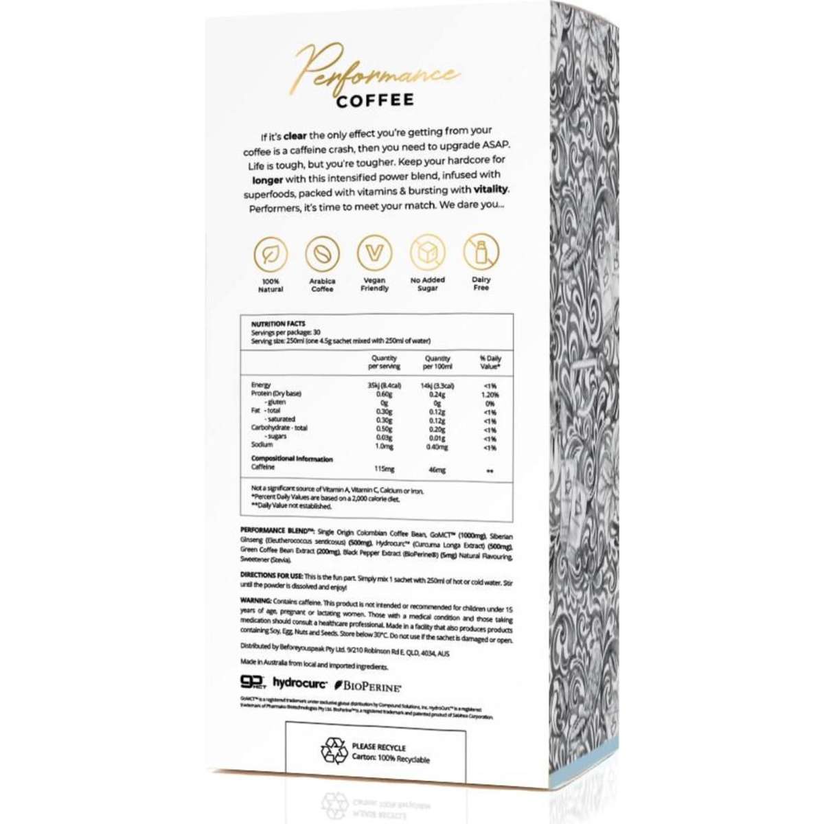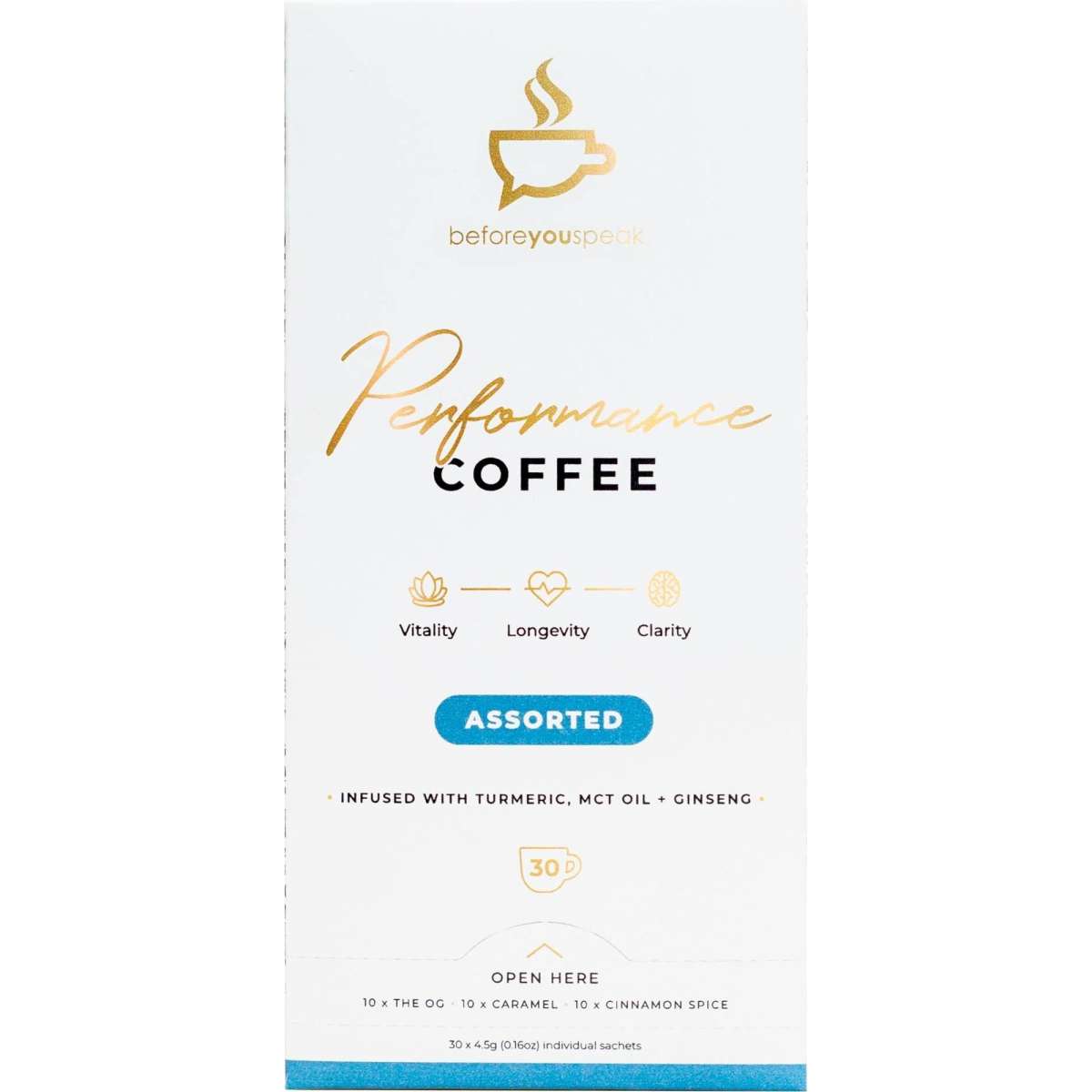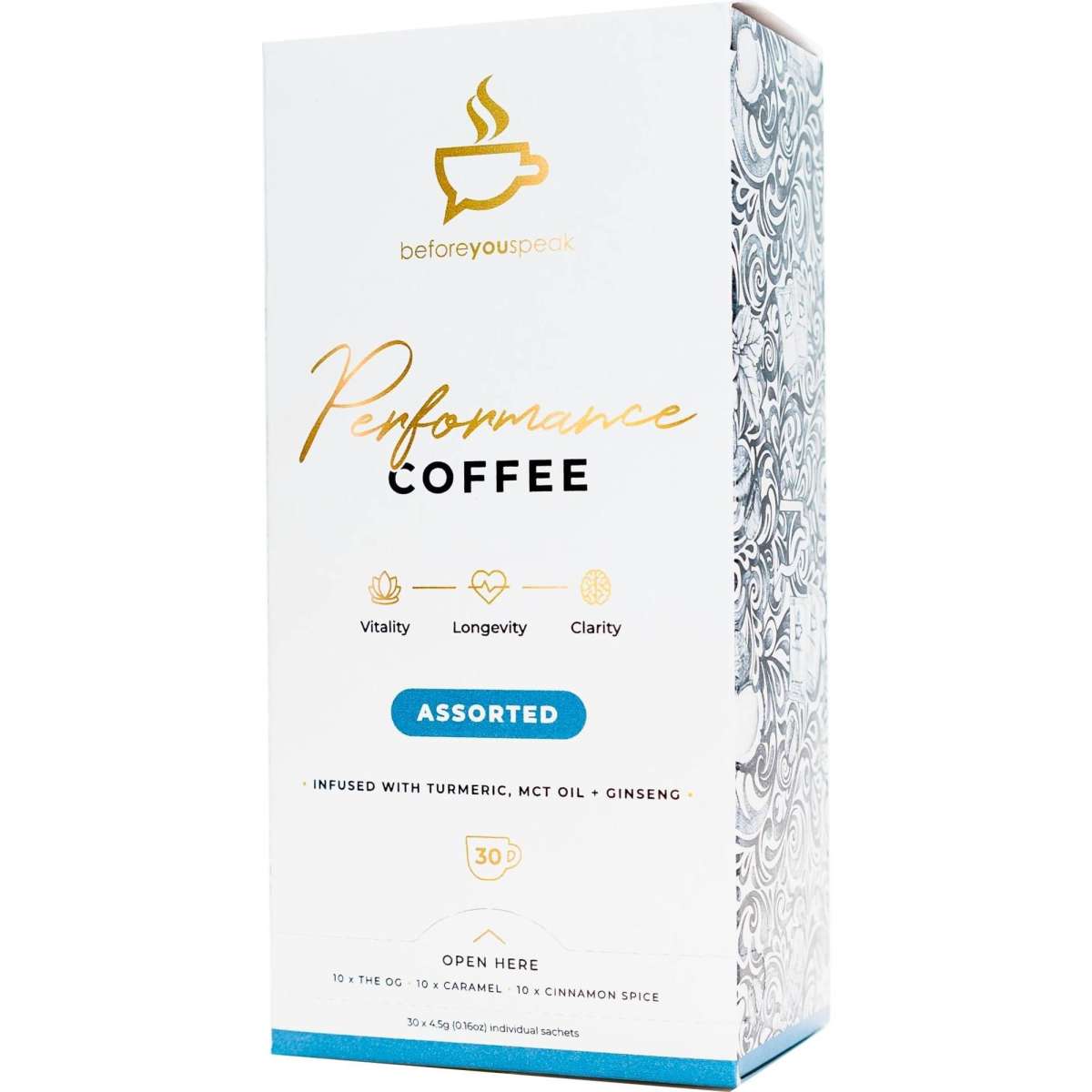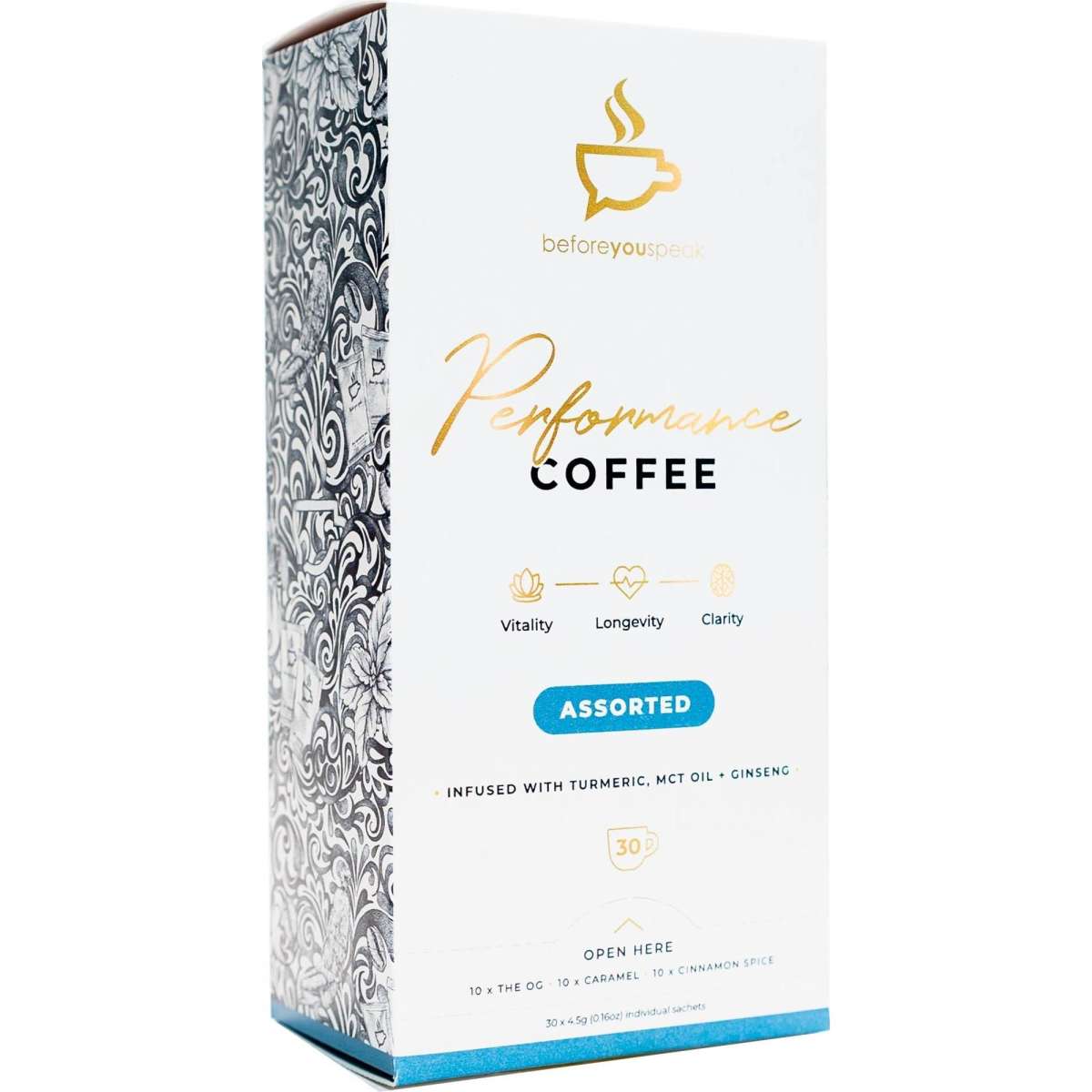 The Assorted Performance Coffee by Beforeyouspeak Coffee is a mixed box containing 30 sachets of their signature blends:10 x OG, 10 x Caramel and 10 x Cinnamon. Each one made with single origin Colombian coffee infused with turmeric, MCT oil & Siberian ginseng and finished with a spicy kick of black pepper.
