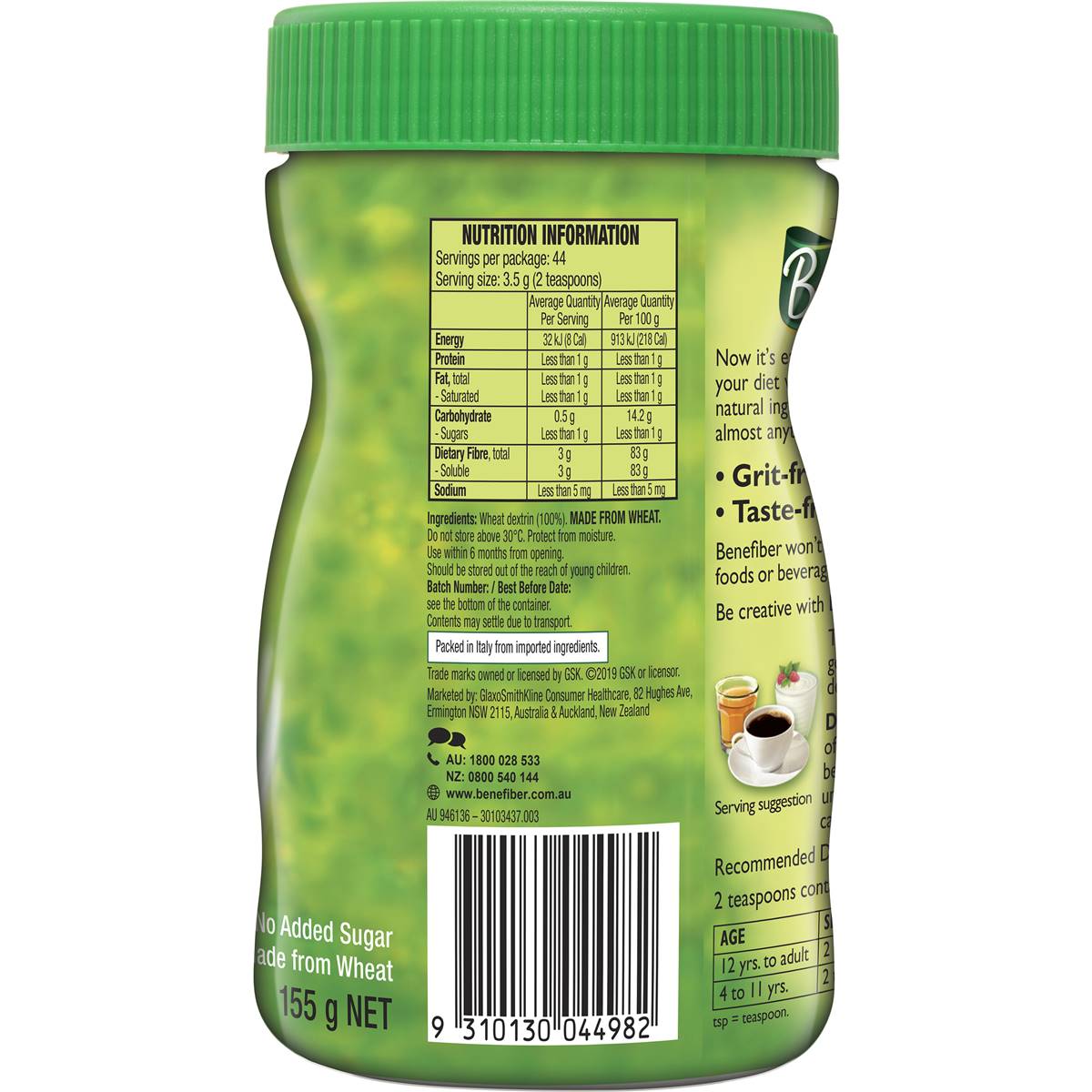 Benefiber is a daily fibre supplement made from 100% natural ingredients. Benefiber makes taking fibre easier. It dissolves in most beverages and soft foods. Taste-free, no added sugar and made from wheat.