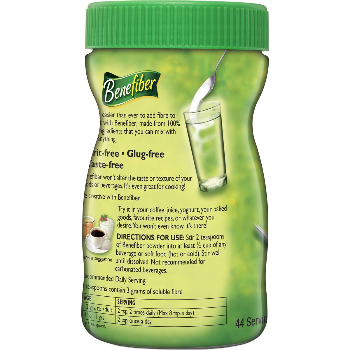 Use within 6 months from opening.HOW TO ADD BENEFIBER NATURAL FIBRE SUPPLEMENT TO YOUR DAILY ROUTINE:Stir 2 teaspoons of Benefiber powder into at least 1/2 cup of beverage or soft food (hot or cold). Stir well until dissolved. Not recommended for carbonated beverages.Recommended Daily Serving: 2 teaspoons contain 3 grams of soluble fibreAge: 12 years to adult, Serving: 2 tsp 2 times daily (Max 8 tsp a day)Age: 4 to 11 years, Serving: 2 tsp once a daytsp = teaspoon