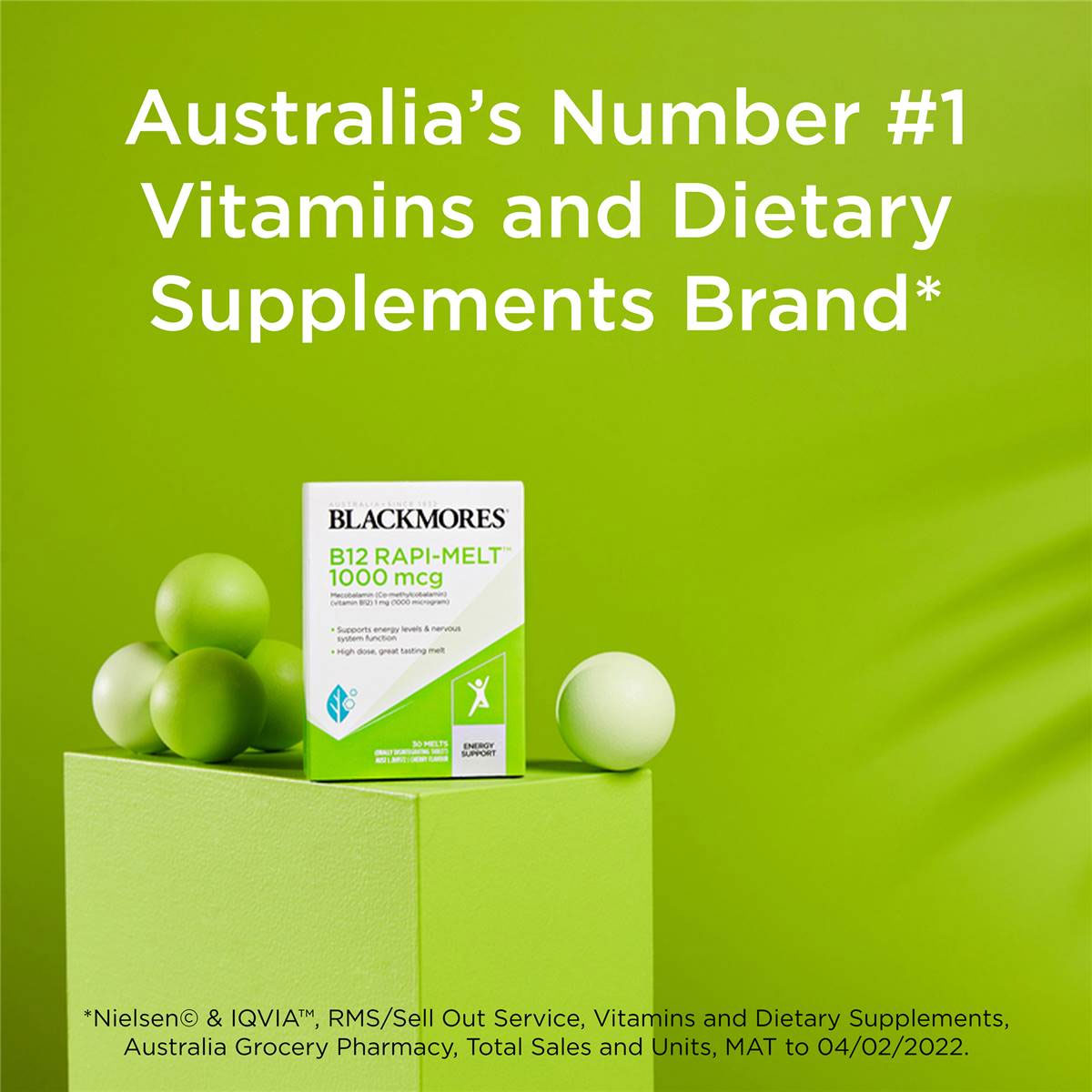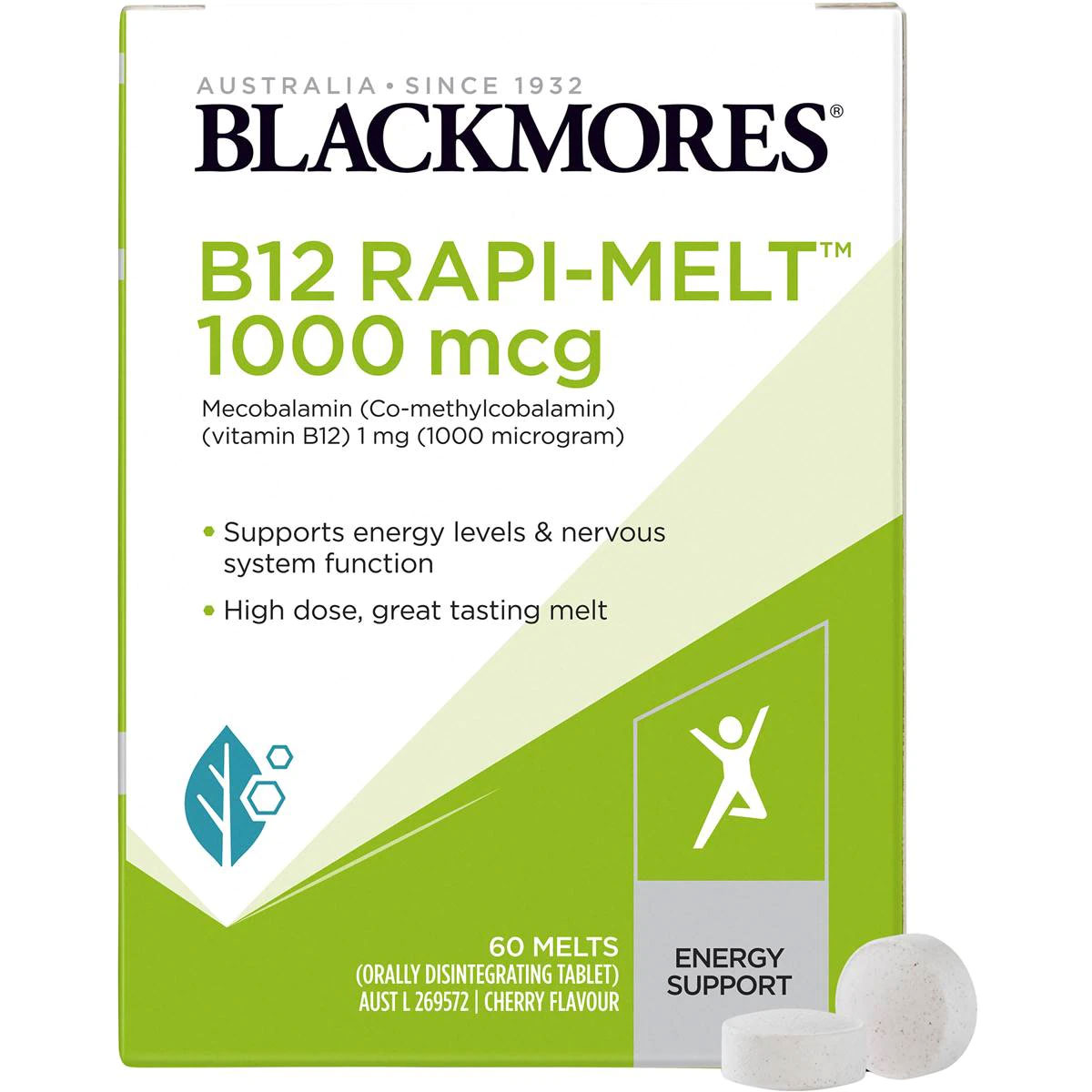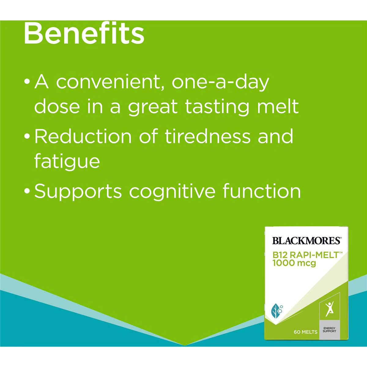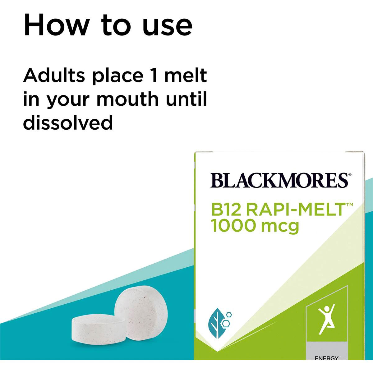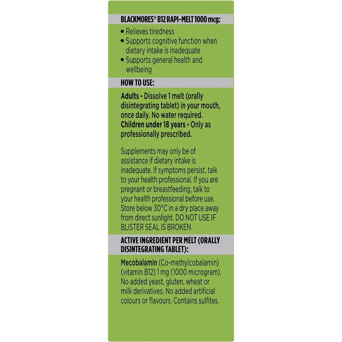 Blackmores B12 Rapi Melt 1000 mcg is a great tasting melt which supports vitamin B12 within normal range in a convenient one-a-day dose and supports energy levels