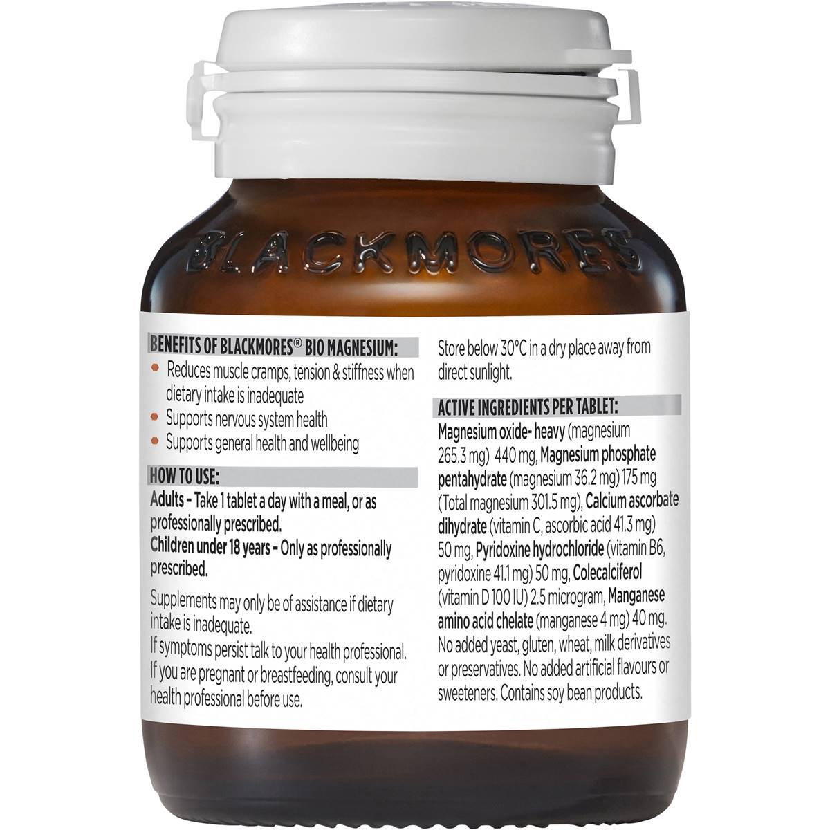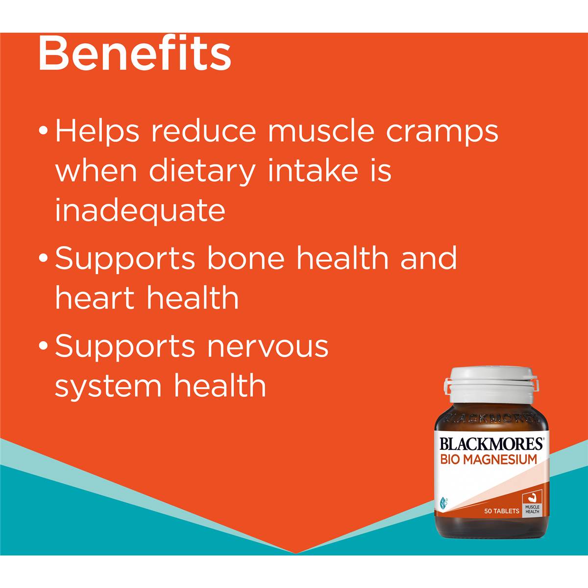Blackmores Bio Magnesium is a high dose tablet to reduce muscle cramps, tension and stiffness when dietary intake is inadequate. The one-a-day formula also supports heart, bone and nervous system health.
