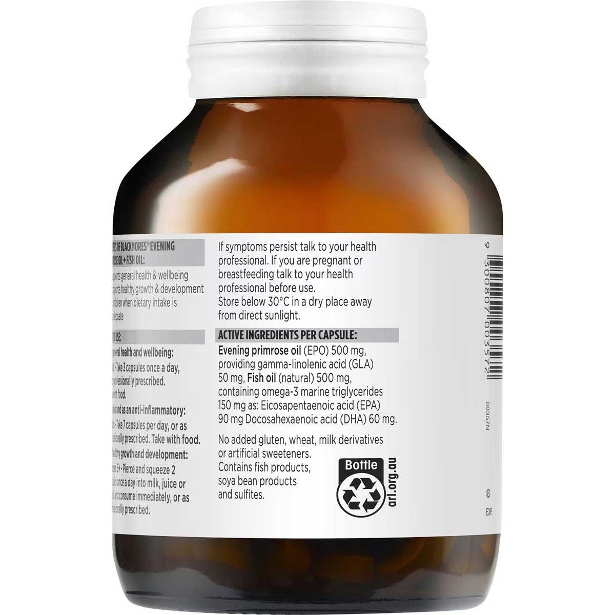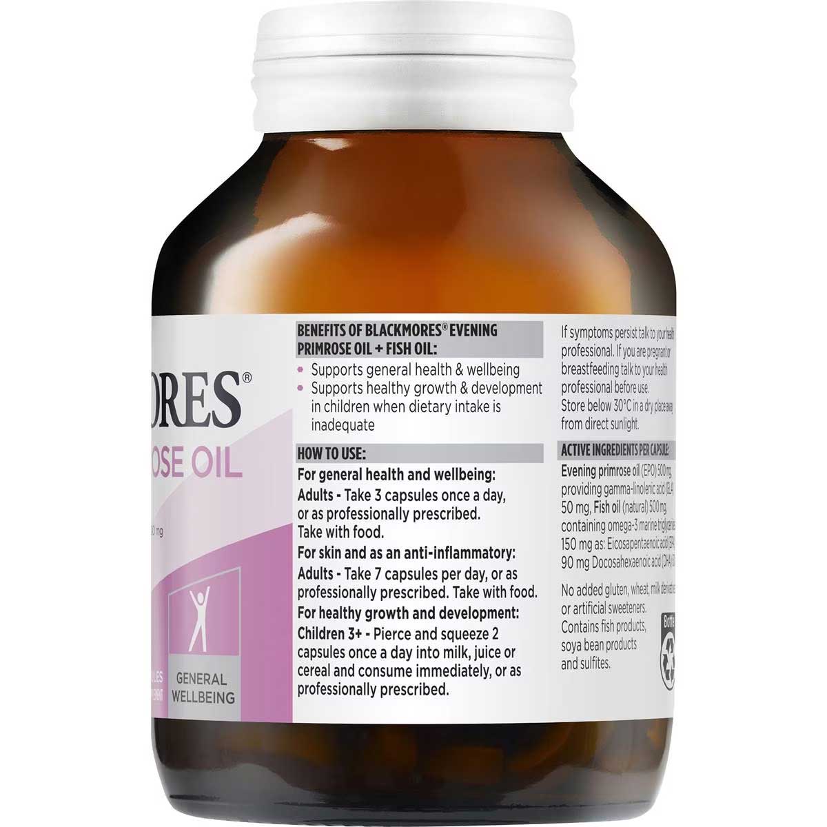 Blackmores Evening Primrose Oil + Fish Oil is a natural source of omega-3 and omega-6 essential fatty acids, which are important for the structure and function of cell membranes and healthy skin and hair, as well as healthy joints. Halal certified.