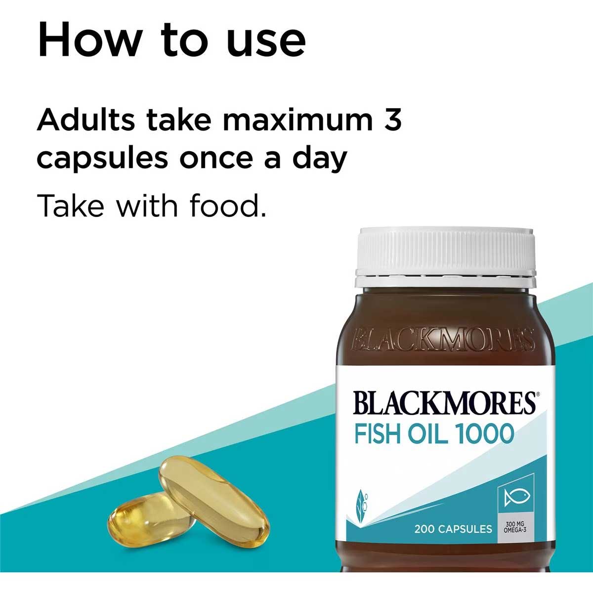 If your diet is low in fish, get the nutrient support you need with Blackmores Fish Oil 1000 capsules. This product provides a high-quality natural source of omega-3 to help maintain the health of your heart, skin, eyes and brain. Blackmores Fish Oil 1000 is extracted from 100% wild caught fish and is ideal if you don’t eat fish two to three times per week. The extraction process ensures purified, high-quality oil that is tested for mercury, dioxins and PCBs. Adults: Take 2 capsules once a day of Blackmores Fish Oil 1000 to support your