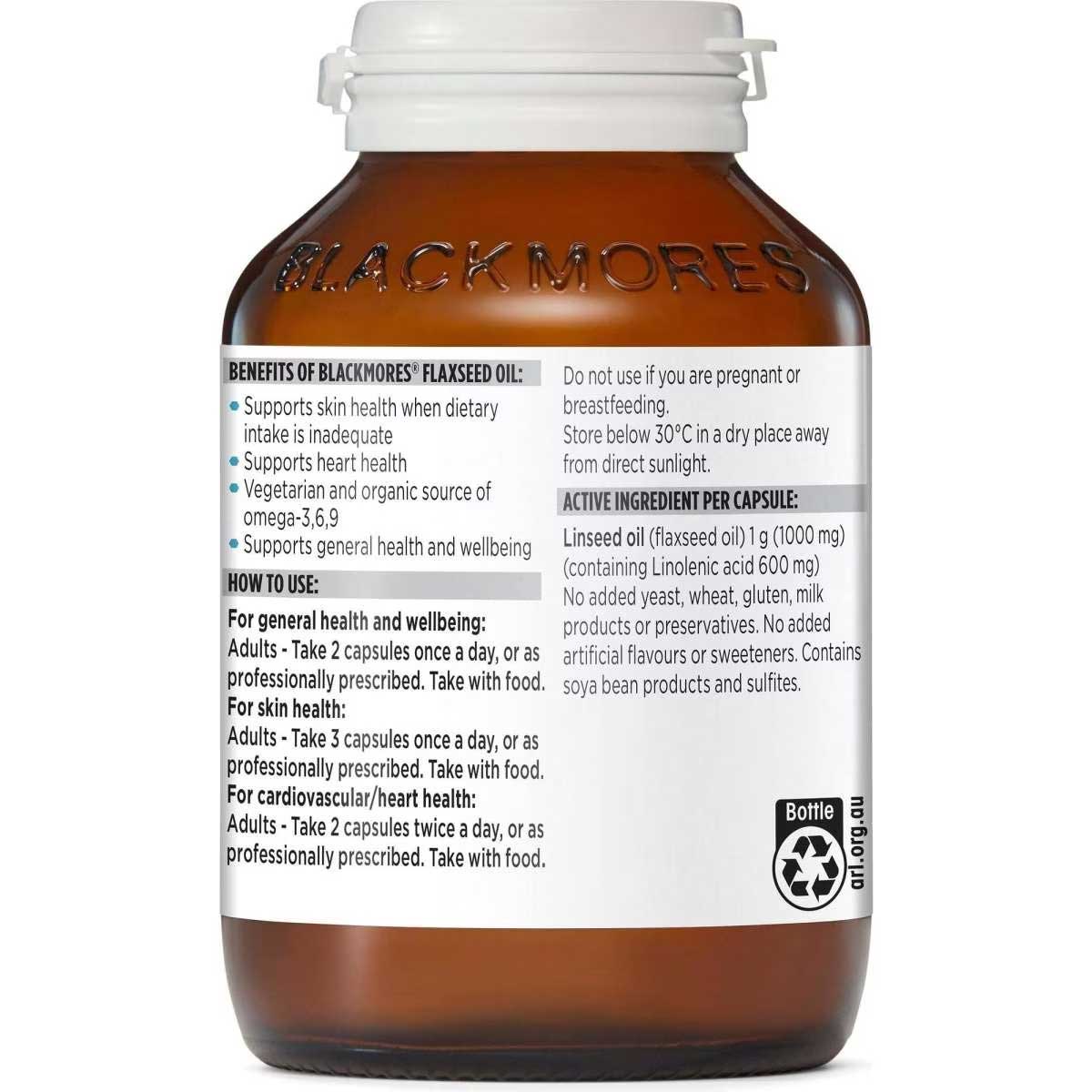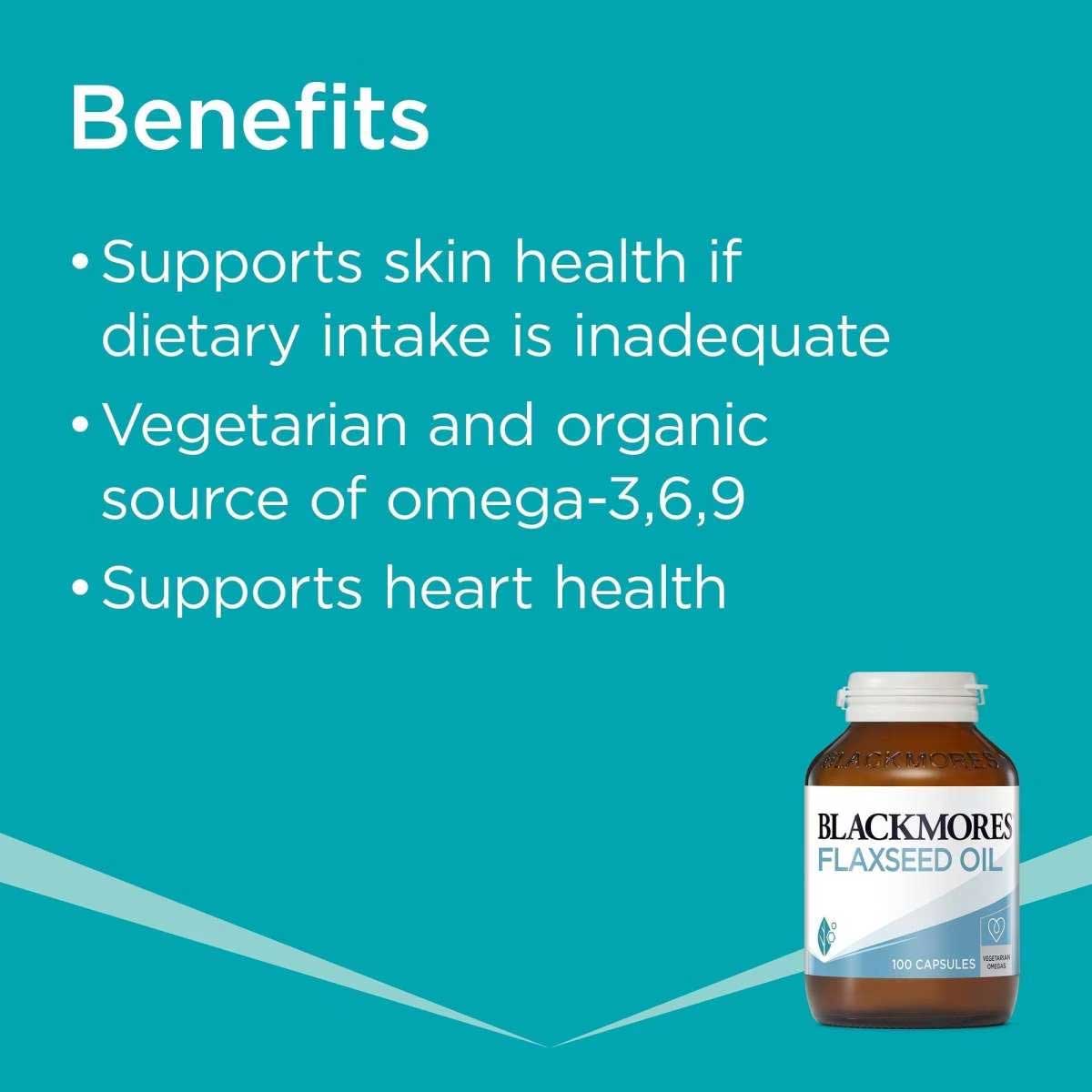 Support your heart and cardiovascular health with Blackmores Flaxseed Oil capsules. Flaxseed oil is a rich plant source of omega-3, 6 and 9 essential fatty acids. This oil is derived from the seeds of the Flax plant and is suitable for vegetarians. If your dietary intake is inadequate, Adults: Take 3 capsules once a day to maintain your skin health.