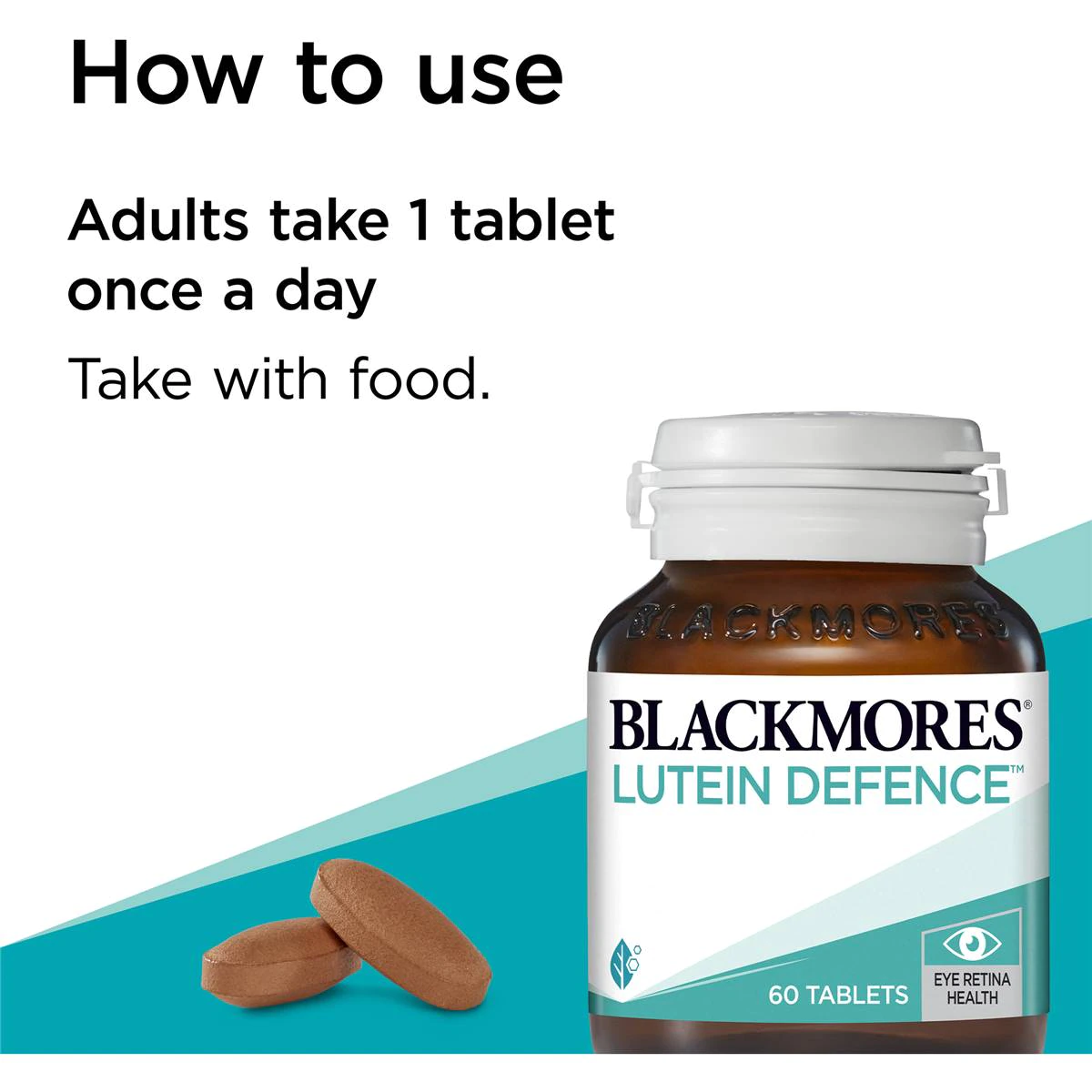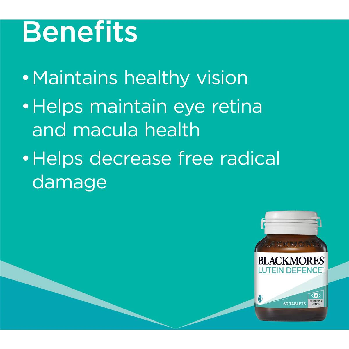 Blackmores Lutein Defence™ contains Lutein and Zeaxanthin, to help reduce free radical damage and support eye macula and retina health. (Eye, everyday health)