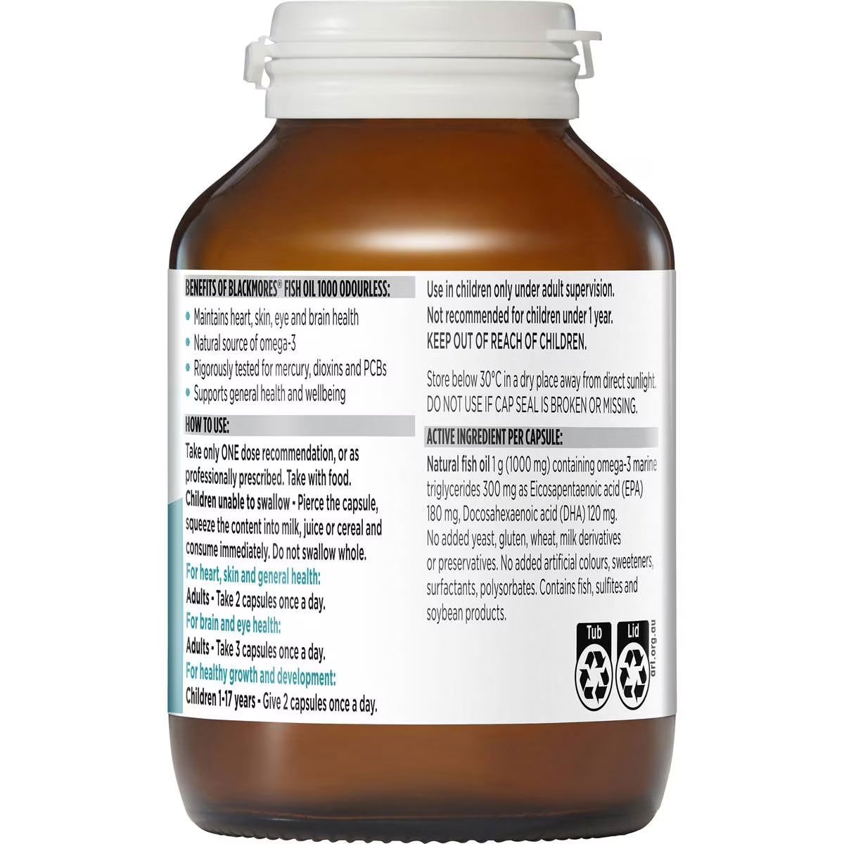 Blackmores Fish Oil 1000 Odourless provides a high-quality natural source of omega-3. It contains 300 mg of omega-3 per capsule to maintain heart, skin, eye and brain health and is ideal if you don’t eat fish 2-3 times per week.