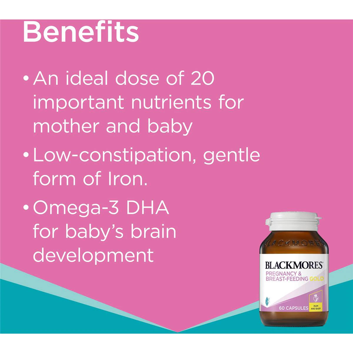 Blackmores Pregnancy & Breast-Feeding Gold provides an ideal dose of 20 important nutrients for mother including folic acid, iodine and vitamin D3, with supporting nutrients for baby.