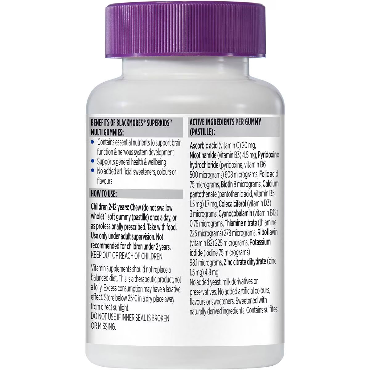 Blackmores Superkids™ Multi Gummies are a 99.9% sugar-free formulation containing a daily of essential nutrients