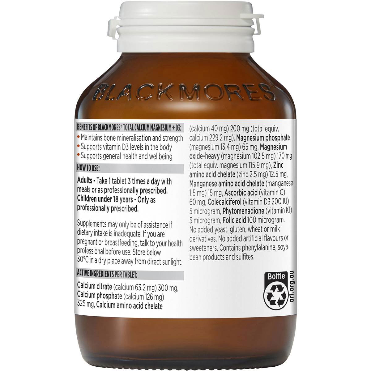 Blackmores Total Calcium Magnesium + D3 contains 3 forms of calcium and magnesium to supports calcium absorption in bones, vitamin D3 levels in the body and helps maintain bone mineralisation and strength. (Calcium, Vitamin D, Everyday Health) Blackmores Total Calcium Magnesium + D3 also supports bone health, muscle function and general health and wellbeing.