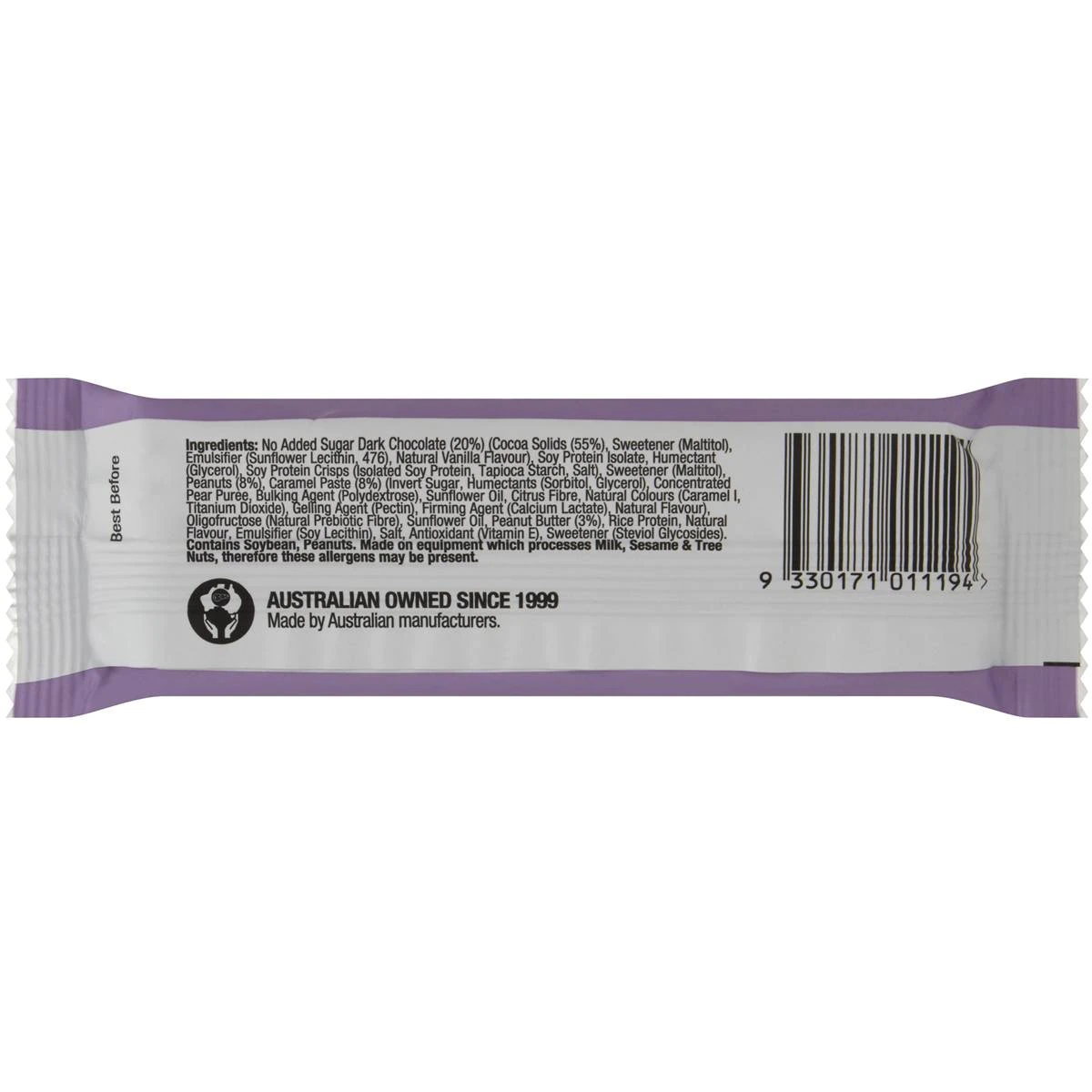 No Added Sugar Dark Chocolate (20%) (Cocoa Solids (55%), Sweetener (Maltitol), Emulsifier (Sunflower Lecithin, 476), Natural Vanilla Flavour), Soy Protein Isolate, Humectant (Glycerol), Soy Protein Crisps (Isolated Soy Protein, Tapioca Starch, Salt), Sweetener (Maltitol), Peanuts (8%), Caramel Paste (8%) (Invert Sugar, Humectants (Sorbitol, Glycerol), Concentrated Pear Puree, Bulking Agent (Polydextrose), Sunflower Oil, Citrus Fibre, Natural Colours (Caramel I, Titanium Dioxide), Gelling Agent (Pectin), Firming Agent (Calcium Lactate), Natural Flavour), Oligofructose (Natural Prebiotic Fibre), Sunflower Oil, Peanut Butter (3%), Rice Protein, Natural Flavour, Emulsifier (Soy Lecithin), Salt, Antioxidant (Vitamin E), Sweetener (Steviol Glycosides)