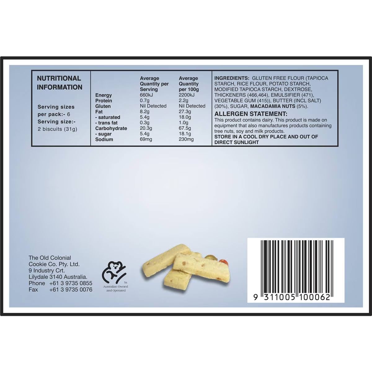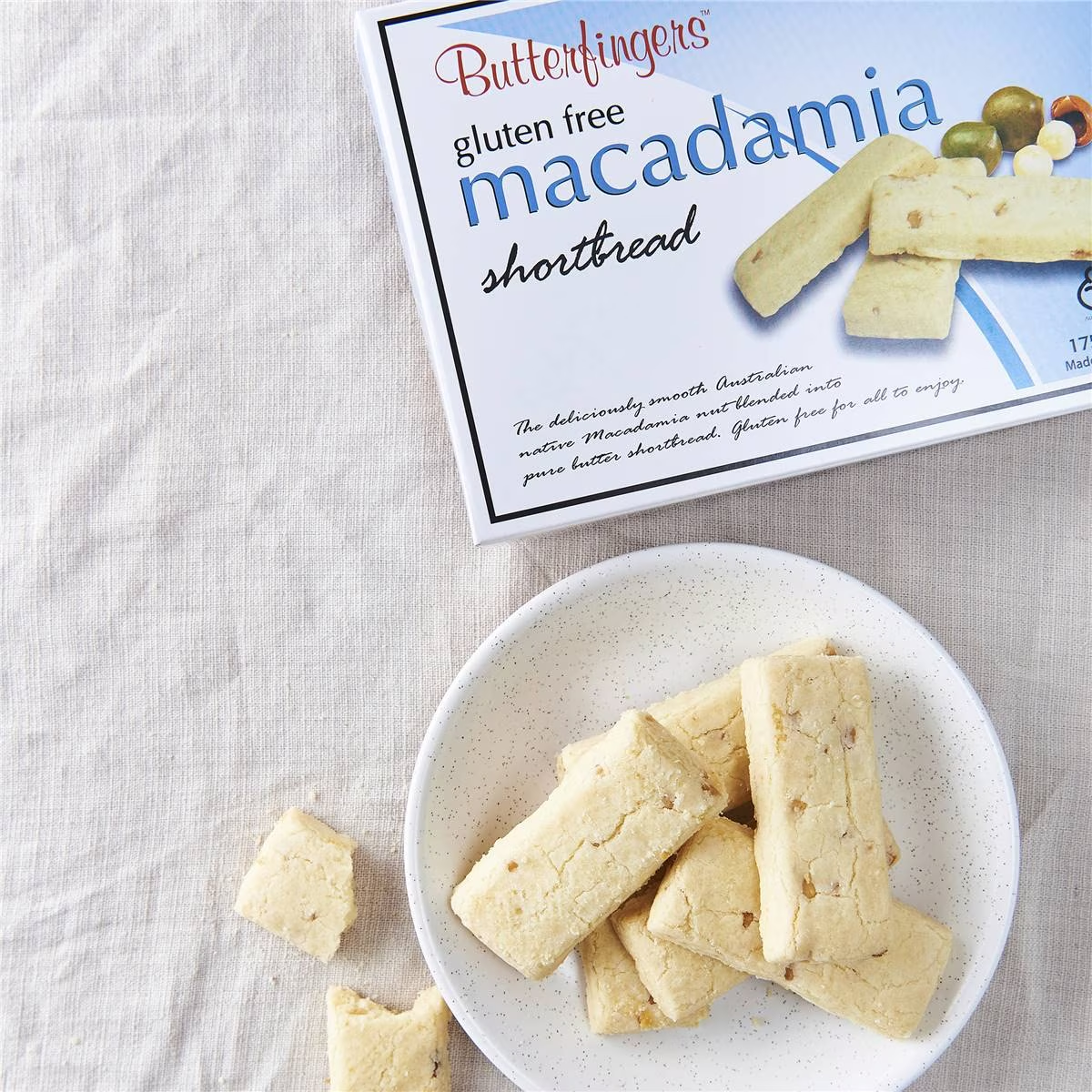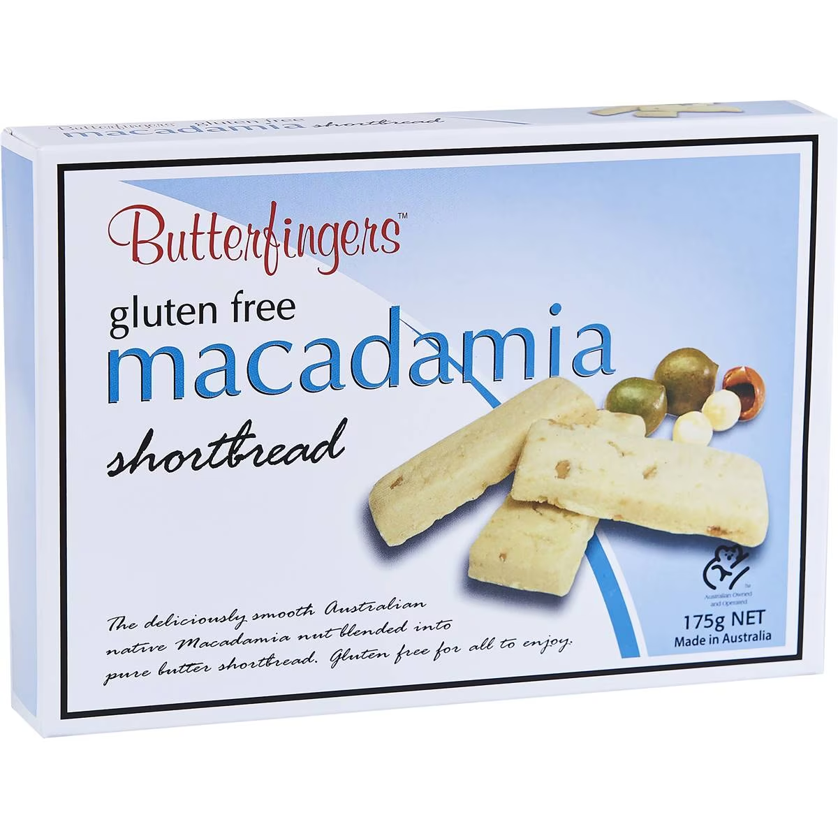 Known as Australia’s finest shortbread, Butterfingers originate from Lilydale in Victoria’s picturesque Yarra Valley. Butterfingers Gluten Free Macadamia Shortbread is made using the finest gluten free flour, butter and sugar, with no preservatives, artificial colourings or flavours. Butterfingers Gluten Free Macadamia Shortbread is made with Australian native macadamias, blended into a pure butter gluten free shortbread for everyone to enjoy. Each 175g box contains 12 gluten free shortbread biscuit fingers.