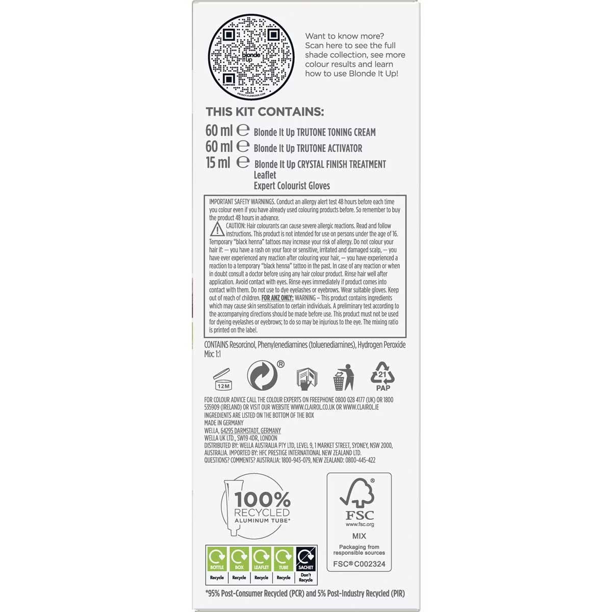 SAFETY DIRECTIONS: WARNING -IRRITANT. AVOID CONTACT WITH EYES. DO NOT SWALLOW. FIRST AID: FOR ADVICE CONTACT A POISONS INFORMATION CENTRE (PHONE AUSTRALIA 131126 AND NEW ZEALAND 0800 764 766) OR A DOCTOR AT ONCE. IF SWALLOWED, DO NOT INDUCE VOMITING. IF IN EYES HOLD EYELIDS APART AND FLUSH THE EYE CONTINUOUSLY WITH RUNNING WATER. CONTINUE FLUSHING UNTIL ADVISED TO STOP BY THE POISONS INFORMATION CENTRE OR A DOCTOR, OR FOR AT LEAST 15 MINUTES. IF SKIN OR HAIR CONTACT OCCURS, REMOVE CONTAMINATED CLOTHING AND FLUSH SKIN AND HAIR WITH RUNNING WATER. WARNING – This product contains ingredients which may cause skin sensitisation to certain individuals. A preliminary test according to the accompanying directions should be made before use. This product must not be used for dyeing eyelashes or eyebrows; to do so may be injurious to the eye. Avoid contact with eyes. Rinse eyes immediately if product comes into contact with them. Rinse hair well after application. Do not use to dye eyelashes or eyebrows. Wear suitable gloves. CAUTION: Hair colourants can cause severe allergic reactions. Read and follow instructions. This product is not intended for use on persons under the age of 16. Temporary ?black henna tattoos may increase your risk of allergy. Do not colour your hair if: – you have a rash on your face or sensitive, irritated and damaged scalp, – you have ever experienced any reaction after colouring your hair, – you have experienced a reaction to a temporary ?black henna tattoo in the past. In case of any reaction or when in doubt consult a doctor before using any hair colour product. The mixing ratio is printed on the label. Mix 1:1 Contains Hydrogen Peroxide, Resorcinol and Phenylenediamines. For questions call 1800 943 079 (AU) or 0800445 422 (NZ)