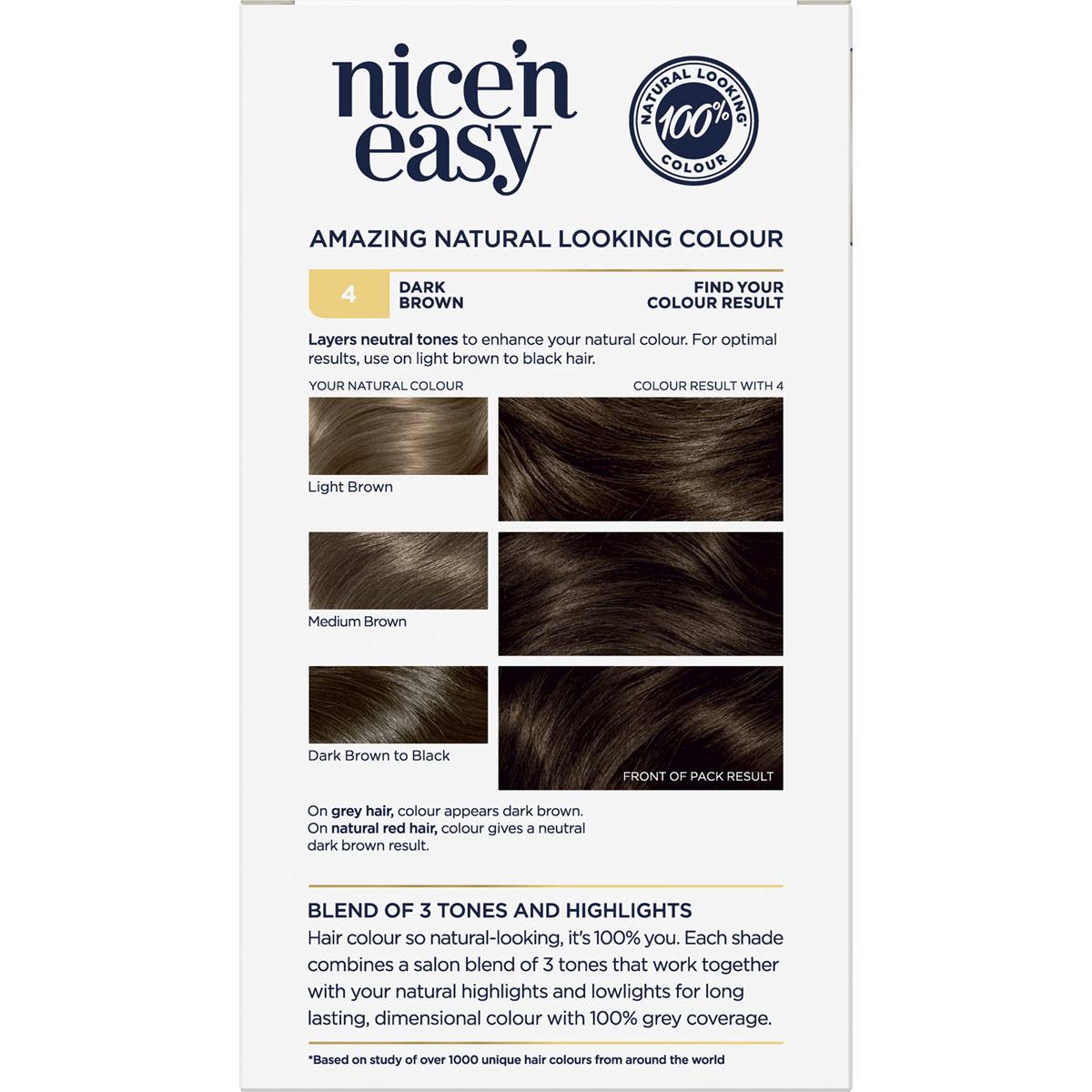 Nice ‘N Easy lasts up to 8 weeks and promises 100% grey coverage. We have also included our exclusive ColourSeal Conditioning Gloss to help seal in beautiful, natural-looking colour and add intense shine.