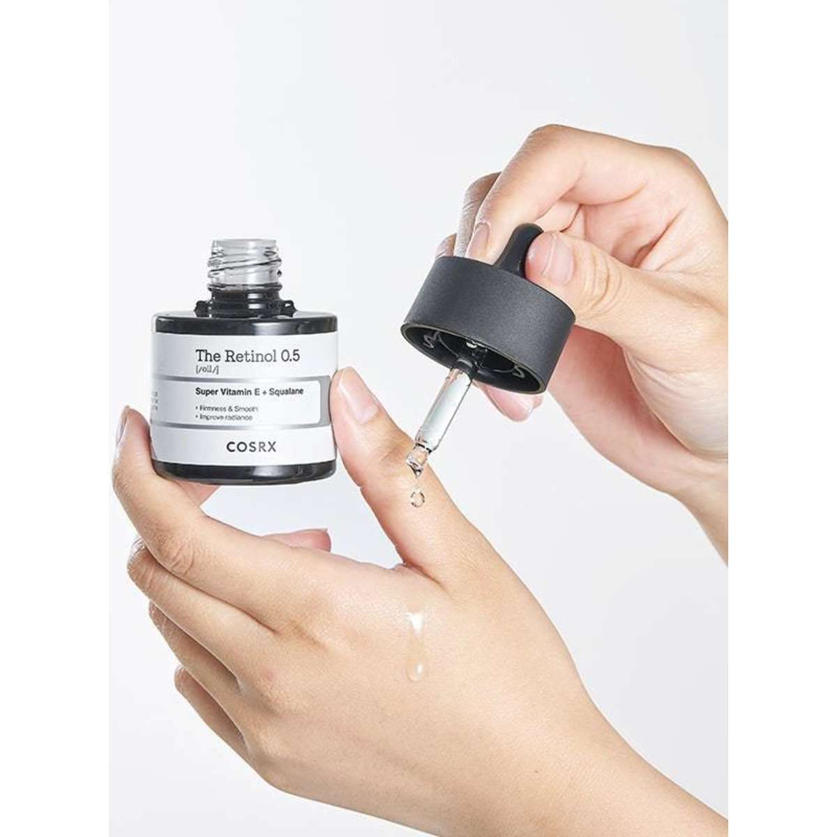 COSRX The Retinol 0.5 Oil is a highly concentrated Korean facial oil that is formulated with 0.5% of stabilized, pure retinol. This powerful anti-aging face oil works by boosting collagen production to improve the appearance of fine lines and wrinkles, while increasing skin cell regeneration. The addition of squalane and super Vitamin E works in harmony with Vitamin A to protect the skin against external environmental stressors to reduce visible skin damage, leaving you with elastic, radiant and silky smooth complexion.