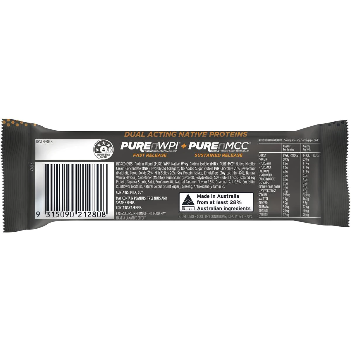 Protein Blend (PUREnWPI? Native Whey Protein Isolate (Milk), PUREnMCC? Native Micellar Casein Concentrate (Milk), Hydrolysed Collagen), No Added Sugar Protein Milk Chocolate 20% (Sweetener (Maltitol), Cocoa Solids 33%, Milk Solids 20%, Soy Protein Isolate, Emulsifiers (Soy Lecithin, 476), Natural Vanilla Flavour), Sweetener (Maltitol), Humectant (Glycerol), Polydextrose, Soy Protein Crisps (Isolated Soy Protein, Tapioca Starch, Salt), Sunflower Oil, Natural Caramel Flavour 1.5%, Guarana, Salt 0.5%, Emulsifier (Sunflower Lecithin), Natural Colour (Burnt Sugar), Ginseng, Antioxidant (Vitamin E).