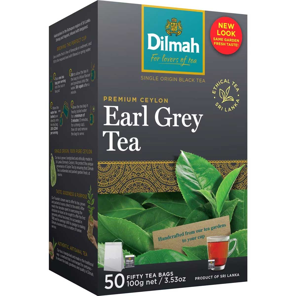 With the piquant citrus note that is characteristic of the classic Earl Grey tea, the bold base of Ceylon Tea from the Ratnapura region creates a truly refined experience. The earthy is balanced by the sweet floral of the bergamot, creating a sublimely elegant brew. Together, they form a distinctive, elegant tea perfect for any time of the day. This Dilmah Gourmet Selection Earl Grey tea contains 50 tea cup bags in an airtight foil pouch, protecting taste and flavour.