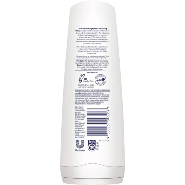 Dove Restoring Ritual Conditioner Coconut Oil and Turmeric strengthens hair and helps reverse the signs of damage. Dove Nourishing Secrets is a range of products that combines the intense nourishment of Dove with aromas inspired by the indulging and caring rituals practiced by women around the world. The aroma of this conditioner is inspired by the rituals of Indian women, who treat their hair with a blend of coconut oil and turmeric. Dove Restoring Ritual shampoo & conditioner help reverse the signs of damage (System use vs. non-conditioning shampoo) and deeply nourish hair from within. For beautifully strong (Less breakage) and visibly restored hair (System use vs. non-conditioning shampoo). Dove the home of real beauty. For over a decade, we’ve been working to make beauty a source of confidence, not anxiety. Dove celebrates a new definition of strength: one with care at its centre. Real strength is shown through the care you give to the people that matter – and that includes you. Whether you’re looking for a deodorant to keep you feeling fresh and dry all day or you want a body wash to help keep your skin hydrated, Dove products are designed to protect and care for your skin. Visit our website to see our full range for each hair type such as coloured hair, damaged hair, split ends, longer hair, hair breakage and more.