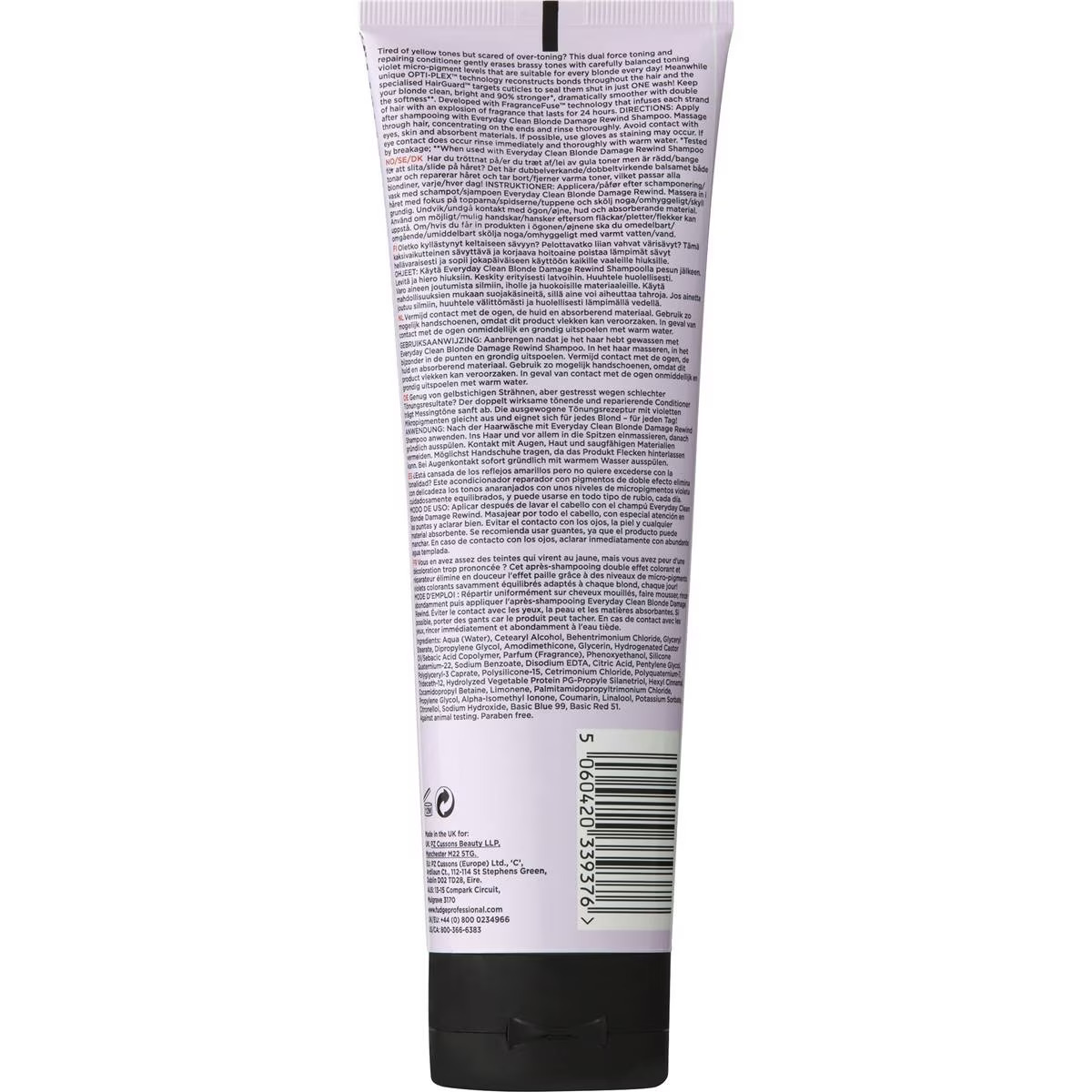 90% stronger hair* Tired of yellow tones but scared of over-toning? This dual force toning and repairing conditioner gently erases brassy tones with carefully balanced toning purple micro-pigment levels that are suitable for every blonde every day! Meanwhile unique OPTI-PLEX™ technology reconstructs bonds throughout the hair and specialised technology targets cuticles to seal them shut in just ONE wash! Keep your blonde clean, bright and 90% stronger*, dramatically smoother with double the softness**. Developed with FragranceFuse™ technology that infuses each strand of hair with an explosion of fragrance that lasts for 24 hours. *Tested by breakage; **When used with Everyday Clean Blonde Damage Rewind Shampoo