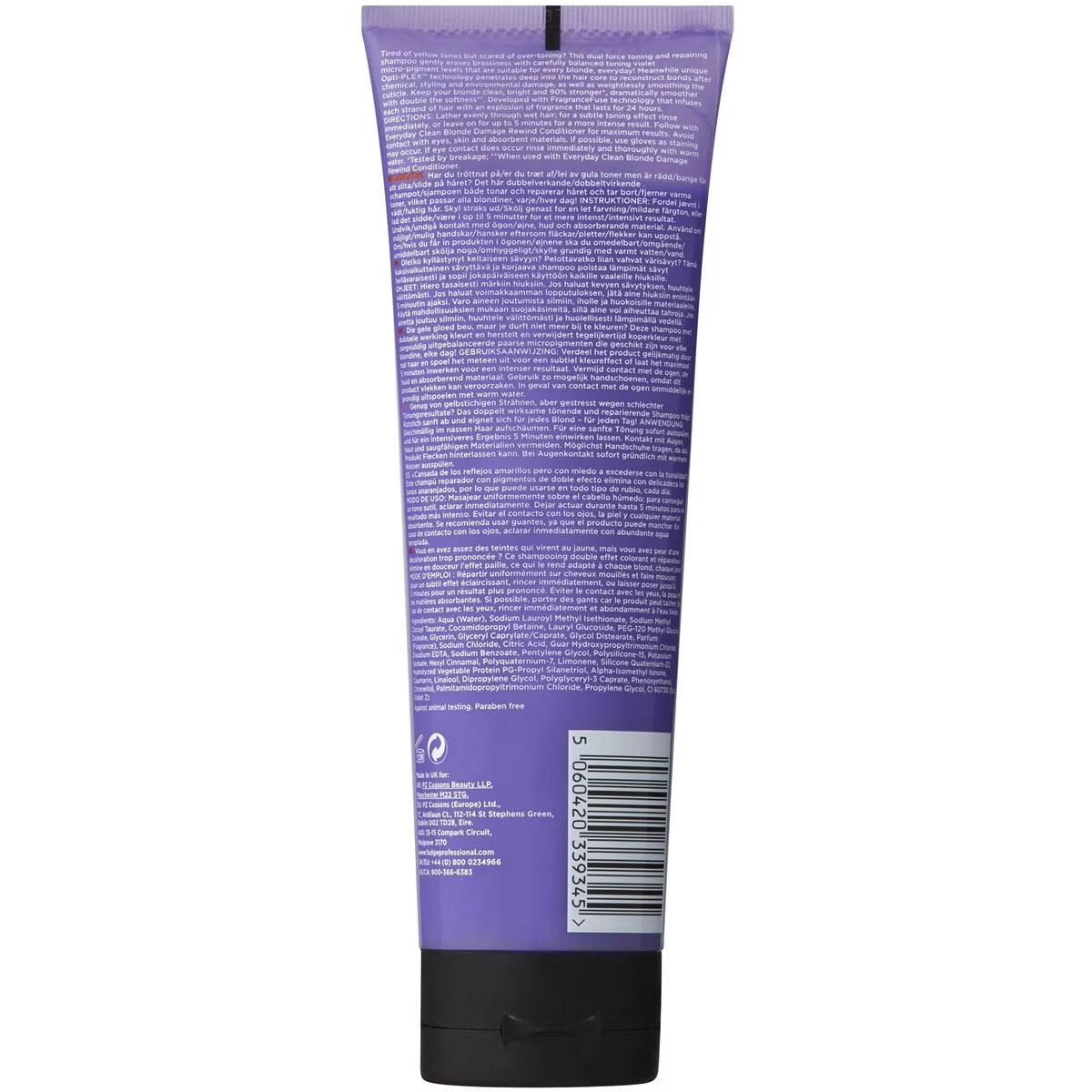 90% stronger hair* Tired of yellow tones but scared of over-toning? This dual force toning and repairing shampoo gently erases brassiness with carefully balanced toning violet micro-pigment levels that are suitable for every blonde, everyday! Meanwhile unique Opti-PLEX™ technology penetrates deep into the hair core to reconstruct bonds after chemical, styling and environmental damage, as well as weightlessly smoothing the cuticle. Keep your blonde clean, bright and 90% stronger*, dramatically smoother with double the softness**. Developed with FragranceFuse technology that infuses each strand of hair with an explosion of fragrance that lasts for 24 hours. *Tested by breakage; **When used with Everyday Clean Blonde Damage Rewind Conditioner.