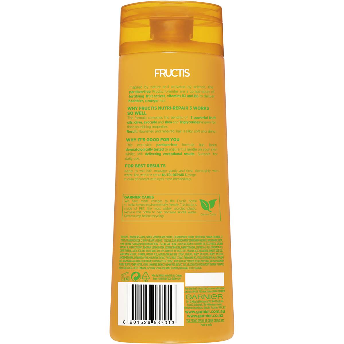 Fructis Nutri-Repair 3 Shampoo contains the unique strength of 3 powerful fruit oils: Olive oil, avocado oil and shea to combat dry hair. It nourishes and repairs hair, leaving it softer and shinier after every use. Paraben-free and dermatologically testedRESULT: Leaves your hair feeling deeply nourished and hydrated.All Garnier products are officially approved by Cruelty Free International.Since 1989, Garnier has been committed to a world without animal testing.