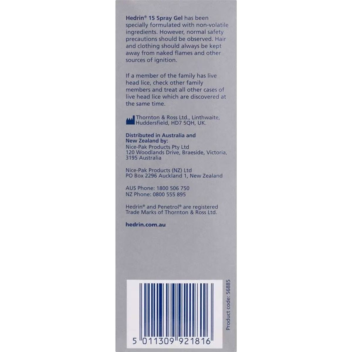 Hedrin 15 Spray Gel has been specially formulated with non-volatile ingredients. However, normal safety precautions should be observed. Hair and clothing should always be kept away from naked flames and other sources of ignition.