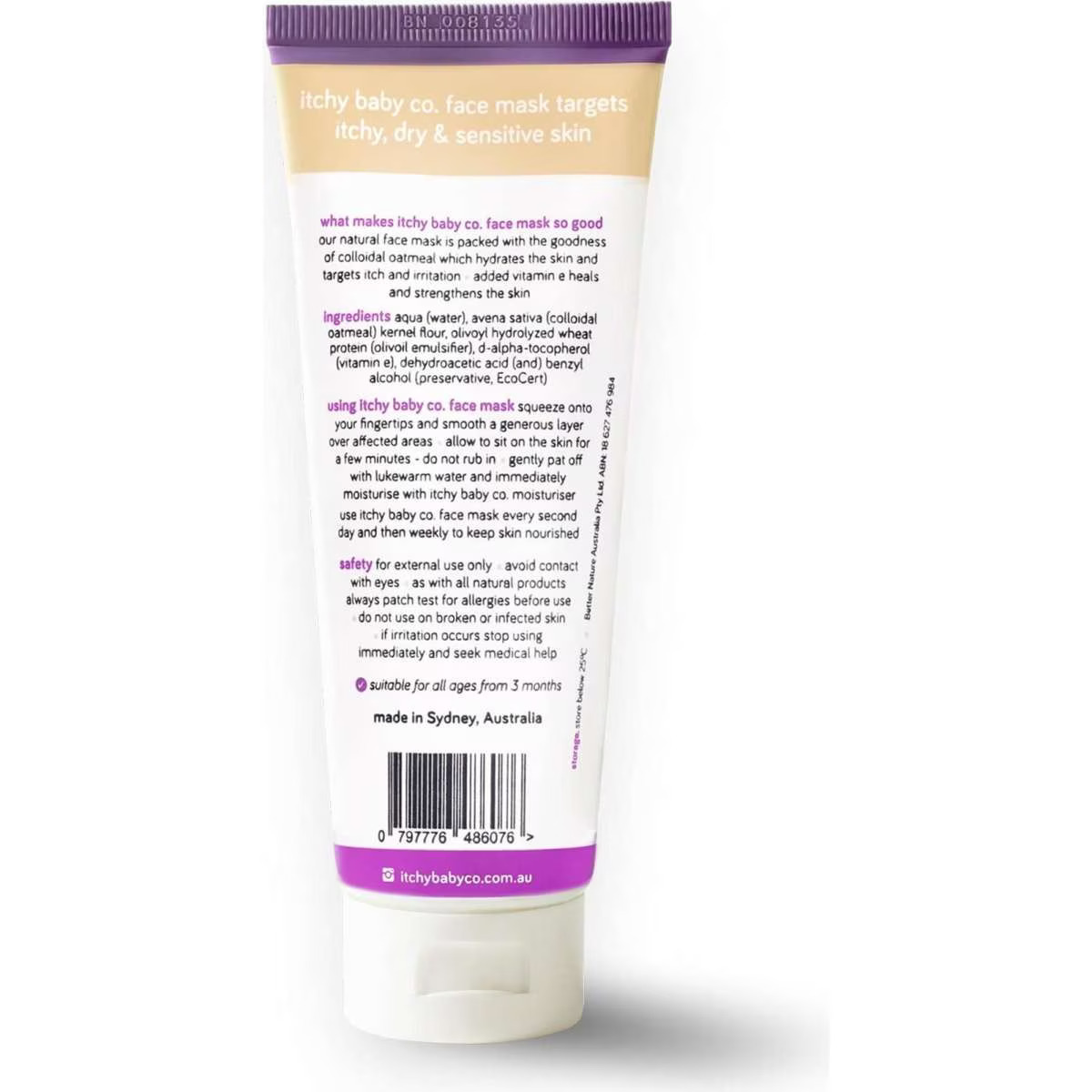 Offering moisturising and soothing goodness, our face mask has been especially developed for children to nourish and hydrate the face. Our itchy baby co. natural face mask is packed with the goodness of oatmeal and vitamin E.
