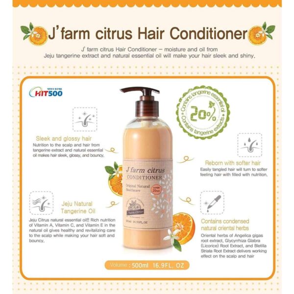 J’ farm citrus hair conditioner contains Jeju Tangerine extracts and Jeju Tangerine oil. It is rich in Vitamin A, C, and E. These rich nutrients nourish hair, protect the hair after shampooing, and prevent static electricity when your hair is dry. It helps maintain calm and smooth hair. In addition, Portulaca extracts and various herbal extracts reduce scalp irritation and help maintain smooth and healthy hair.
