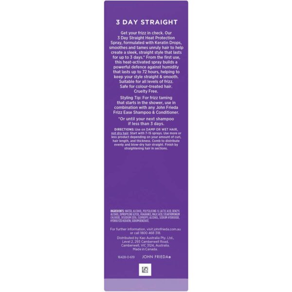 Help create straight, smooth style that lasts up to 3 days.* Formulated with Keratin, this heat-activated semi-permanent styling spray protects against heat damage. Seal in longer-lasting straightness without weighing hair down. 1. SMOOTH YOUR FRIZZY HAIR – Use our Flat Iron Spray as a straight hair styling product for smooth results that last up to 3 days, or your next shampoo. 2. HEAT-ACTIVATED FOR A LONGER STAY – Keep your straight hairstyle with our uniquely formulated Flat Iron Spray for sleek looks that last. 3. STRAIGHT WITHOUT THE WEIGHT – Using a proprietary blend of polymers with keratin protein, our weightless spray removes frizz from each strand. 4. ADD GLOSS BY REMOVING FRIZZ – With our unique, anti-frizz formula, your hair will become glossy and smooth. 5. SALON QUALITY – Combine with John Frieda Frizz Ease Shampoo and Conditioner for frizz fighting results from wild, unmanageable hair.