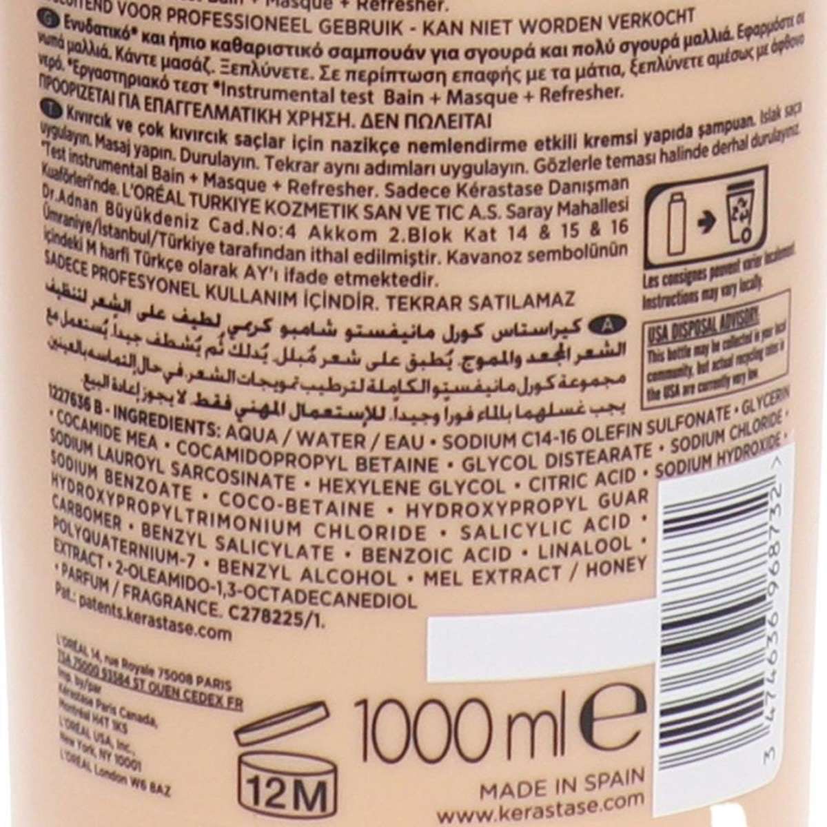 The Kerastase Curl Manifesto Bain Hydratation Douceur Shampoo 1L is a luxurious cleansing solution specifically created for curly hair types. Enriched with Manuka honey and ceramides, it gently cleanses the scalp and hair while providing intense hydration and moisture. This nourishing formula helps to define and enhance natural curls, leaving them soft, manageable, and beautifully revived.
