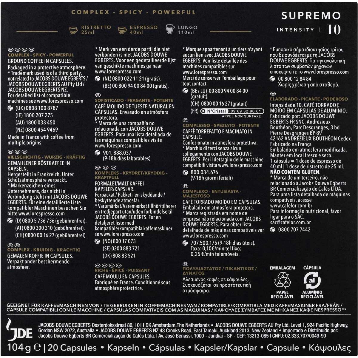 L’OR Espresso Supremo Intensity 10 is a roasty, sweet and rich ground coffee in capsules that is compatible with Nespresso* original coffee machines.