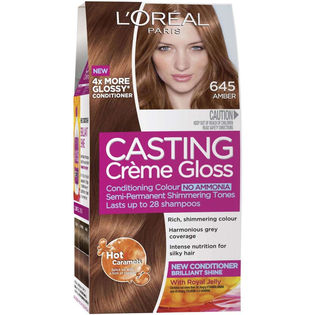 Glossy, healthy and natural looking colour is yours with L’Oreal Paris Casting Creme Gloss. The luxe no-ammonia creme harmoniously blends away greys and delivers rich colour with visible shimmering tones for beautiful depth. During colouring, the creme strengthens and helps protect the hair fibre, inside and out, for hair with exceptional softness and glossy shine. After colouring, the protective properties of Royal Jelly regenerate your hair and enhance the shine of your colour. The delicate fruity fragrance transforms your at-home colouring experience into a true moment of pleasure.