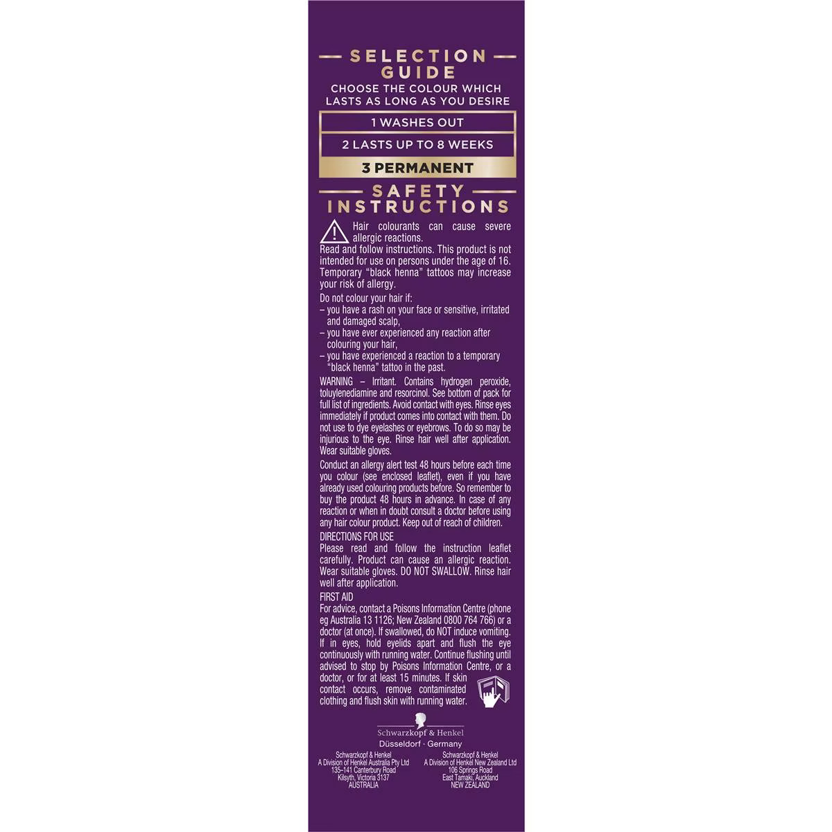 Irritant. Contains hydrogen peroxide, phenylenediamines(toluene diamines), ammonia and hydrogen. See bottom of pack for full list of ingredients. Avoid contact with eyes. Rinse eyes immediately if product comes into contact with them. Do not use to dye eyelashes or eyebrows. To do so may be injurious to the eye. Rinse hair well after application. Wear suitable gloves. Conduct an allergy alert test 48 hours before each time you colour (see enclosed leaflet), even if you have already used colouring products before. So remember to buy the product 48 hours in advance. In case of any reaction or when in doubt consult a doctor before using any hair colour product. Keep out of reach of children.