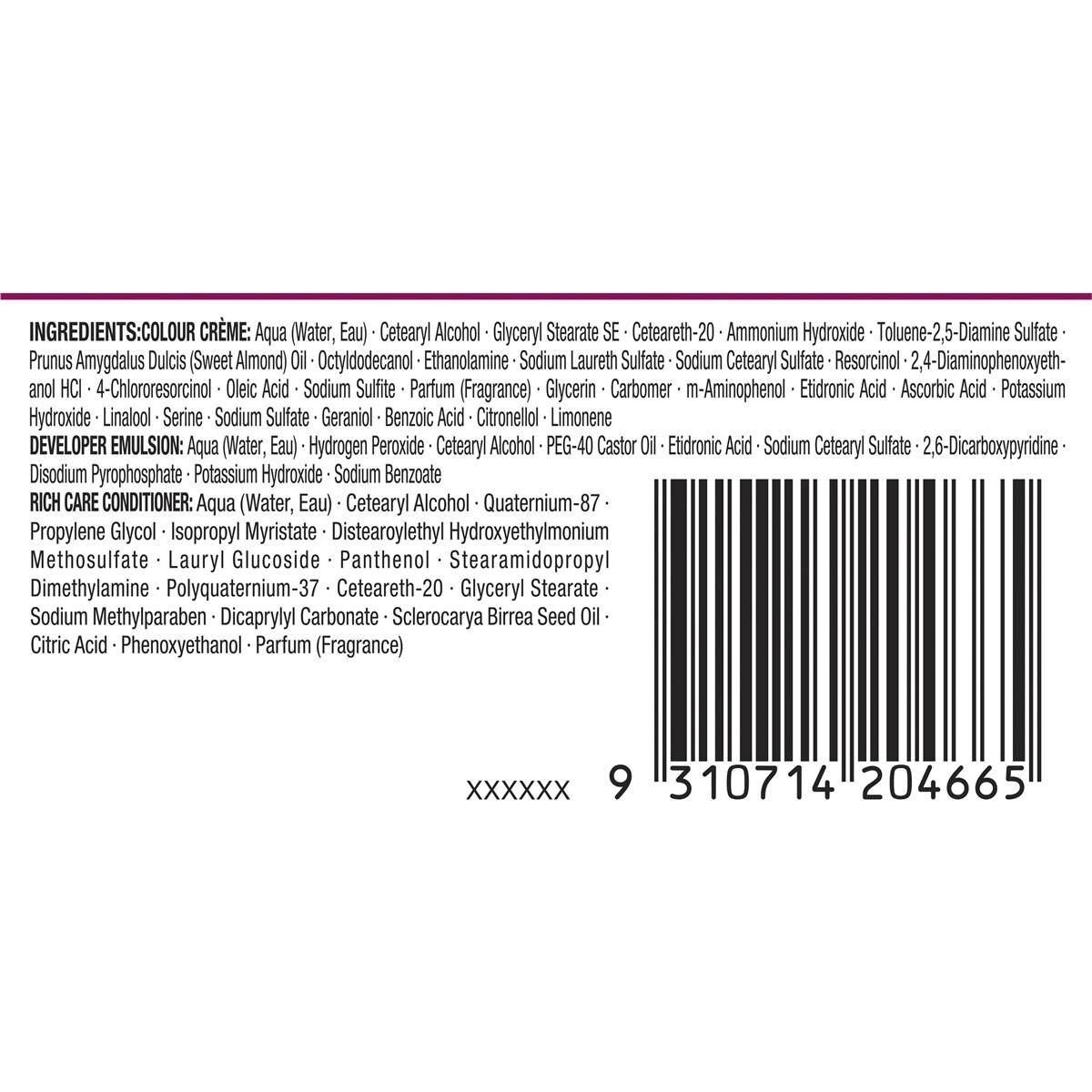 Colour Crme: Aqua(Water, Eau), Cetearyl Alcohol, Glyceryl Stearate, Ammonium Hydroxide, Ceteareth-20, Toluene-2,5-Diamine Sulfate, Octyldodecanol, Prunus Amygdalus Dulcis (Sweet Almond) Oil, Sodium Laureth Sulfate, Ethanolamine, Sodium Cetearyl Sulfate, Resorcinol, Parfum (Fragrance), Serine, 2,4-Diaminophenoxyethanol HCI, 4-Chlororesorcinol, Oleic Acid, Sodium Sulfite, Potassium Stearate, Glycerin, Tetrasodium EDTA, Carbomer, m-Aminophenol, Ascorbic Acid, Argania Spinosa Kernel Oil, Potassium Hydroxide, Linoleamidopropyl PG-Dimonium Phosphate, Sodium Sulfate, Propylene Glycol, Linalool, Benzoic Acid. Developer Emulsion: Aqua (Water, Eau), Hydrogen Peroxide, Cetearyl Alcohol, PEG-40 Castor Oil, Disodium Pyrophosphate, Sodium Cetearyl Sulfate, Disodium EDTA, Sodium Benzoate, Phosphoric Acid.Rich Treatment With Precious Argan Oil: Aqua (Water, Eau), Cetearyl Alcohol, Quaternium-27, Argania Spinosa Kernel Oil, Prunus Armeniaca (Apricot) Kernel Oil, Panthenol, Propylene Glycol, Isopropyl Myristate, Distearoylethyl Hydroxyethylmonium Methosulfate, Citric Acid, Stearamidopropyl Dimethylamine, Phenoxyethanol, Polyquaternium-37, Ceteareth-20, Glyceryl Stearate, Sodium Methylparaben, Dicaprylyl Carbonate, Parfum (Fragrance), Lauryl Glucoside.