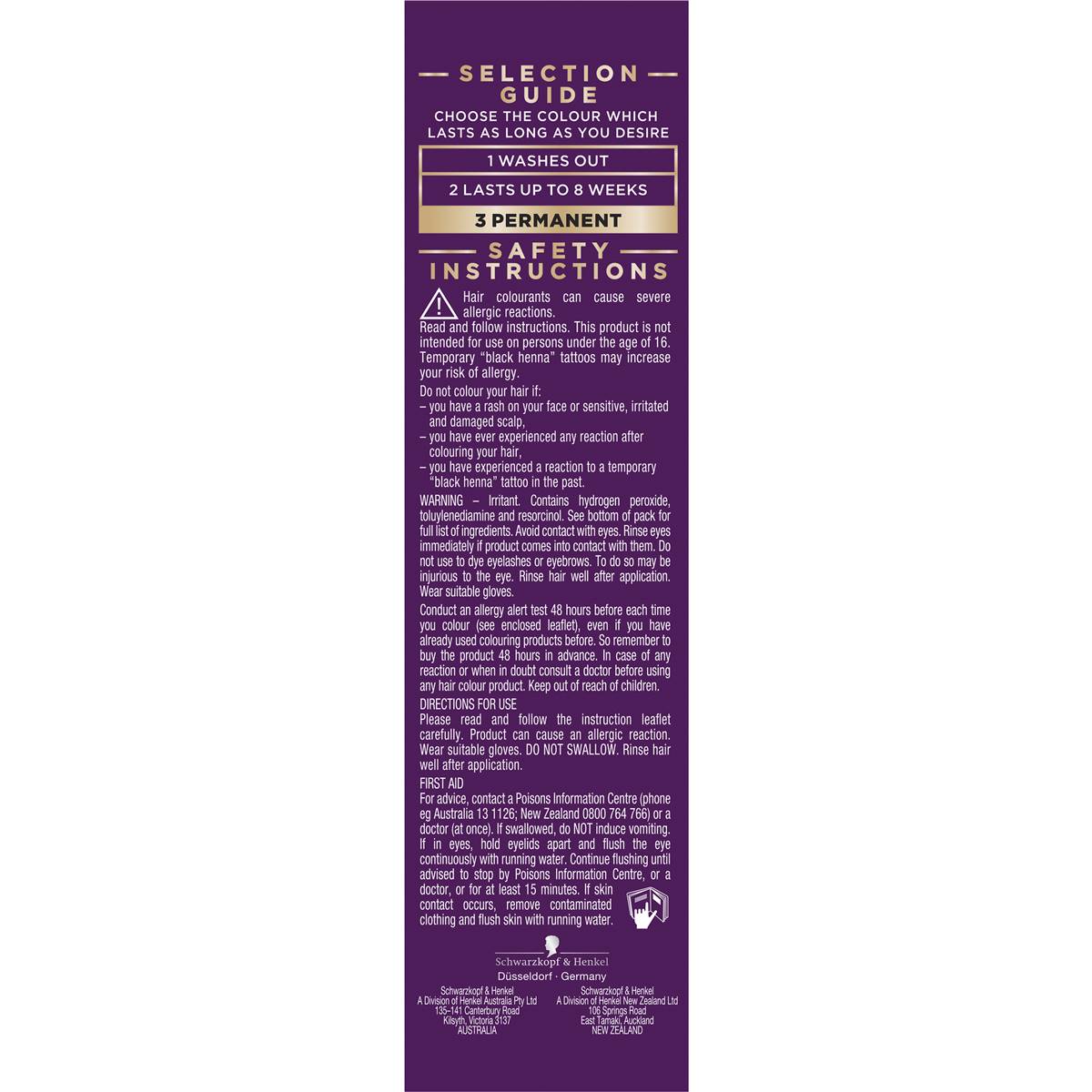 Irritant. Contains hydrogen peroxide, toluylenediamine and resorcinol. See bottom of pack for full list of ingredients. Avoid contact with eyes. Rinse eyes immediately if product comes into contact with them. Do not use to dye eyelashes or eyebrows. To do so may be injurious to the eye. Rinse hair well after application. Wear suitable gloves. Conduct an allergy alert test 48 hours before each time you colour (see enclosed leaflet), even if you have already used colouring products before. So remember to but the product 48 hours in advance. In case of any reaction or when in doubt consult a doctor before using any hair colour product. Keep out of reach of children.