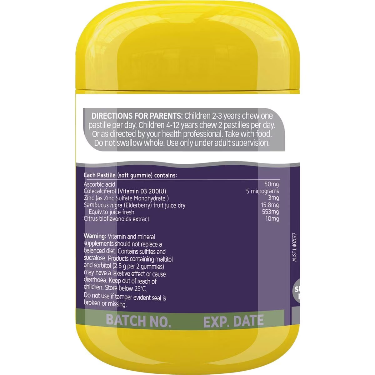 Each Pastille (soft gummie) contains: Ascorbic Acid (Vit C) 50 mg Colecalciferol (Vit D3 200IU) 5 micrograms Zinc (as Zinc Sulfate Monohydrate 3mg Sambucus nigra (Elderberry) fruit juice dry 15.8mg Equiv. to juice fresh 553mgCitrus Bioflavonoids extract 10mg