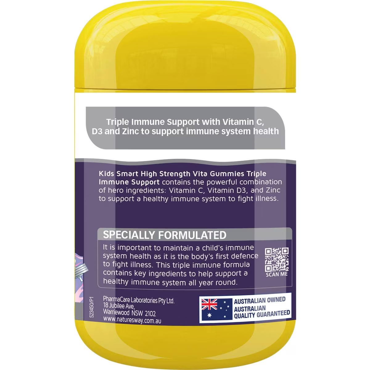 Nature’s Way Kids Smart High Strength Vita Gummies Triple Immune Support contains the powerful combination of immune support hero ingredients: Vitamin C, Vitamin D3 and Zinc to support a healthy immune system to fight illness.