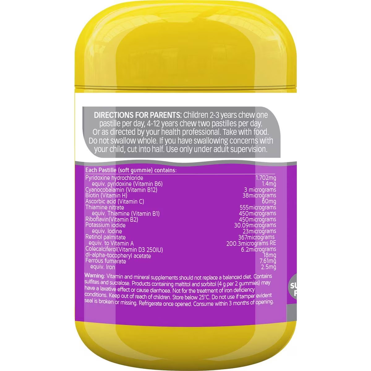 Each Pastille (soft gummie) contains: Pyridoxine hydrochloride 1.702mgEquiv. pyridoxine (Vitamin B6) 1.4mgCyanocobalamin (Vitamin B12) 3 micrograms Biotin (Vitamin H) 38microgramsAscorbic Acid (Vitamin C) 60mgThiamine nitratre 555microgramsEquiv. Thiamine (Vitamin B1) 450microgramsRiboflavin (Vitamin B2) 450microgramsPotassium iodide 30.09mgEquiv. Iodine 23microgramsRetinol palmitate 367microgramsEquiv. to Vitamin A 200.3micrograms REColecalciferol (Vitamin D3 250IU) 6.2microgramsdl-alpha-tocopheryl acetate 18mgFerrous fumarate 7.61mgEquiv. Iron 2.5mg