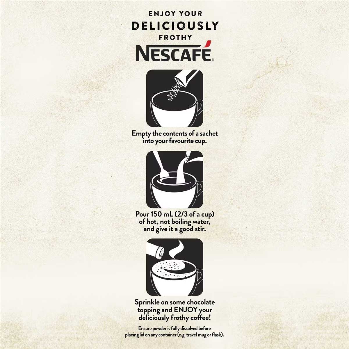 Elevate your daily coffee routine with a delicious cup of NESCAFE Cappuccino. With a delectable layer of velvety froth and quality coffee, enjoy a cafe style creamy cappuccino and treat yourself at any time in the comfort of your own home. All you need to do is add hot water, give it a good stir and top it off with a sprinkle of some choc topping. The result is a delightfully creamy coffee that you can enjoy from the first to the last sip. So whatever you’re up to, Now’s good for a deliciously creamy NESCAFE Cappuccino. If you love this, try the rest of our delicious range.