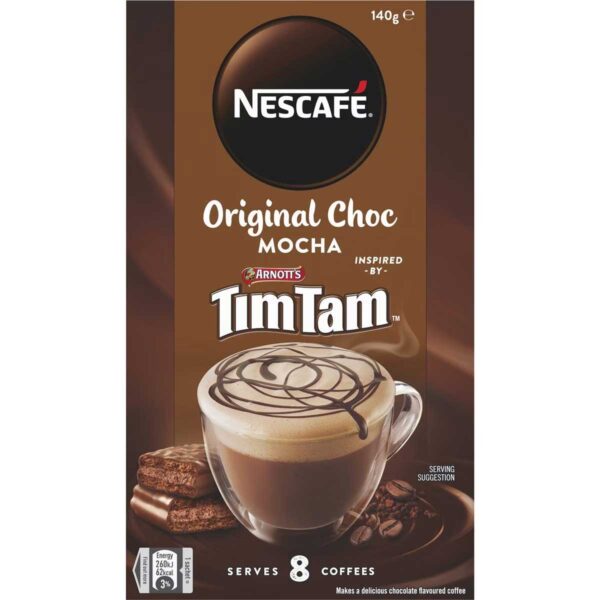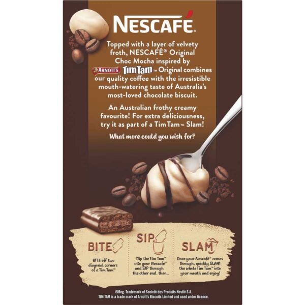 Topped with a layer of velvety froth, NESCAFE Original Choc Mocha inspired by Arnott’s Tim Tam Original combines our quality coffee with the irresistible mouth-watering taste of Australia’s most-loved chocolate biscuit.For even more indulgence try the Tim Tam Slam. BITE – bite off two diagonal corners of a Tim Tam. SIP – Dip the Tim Tam into your Nescafe and SIP through the other end, then…SLAM – once your Nescafe comes through quickly SLAM the whole Tim Tam into your mouth and enjoy!