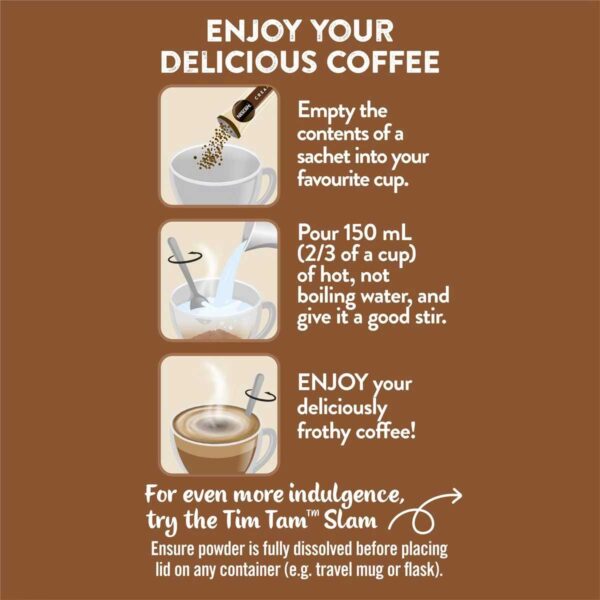 Enjoy your deliciously frothy coffee in two easy steps. First empty the content of a sachet into your favourite cup. Next pour 150ml (23 cup) of hot, not boiling water and give it a good stir. And ENJOY!