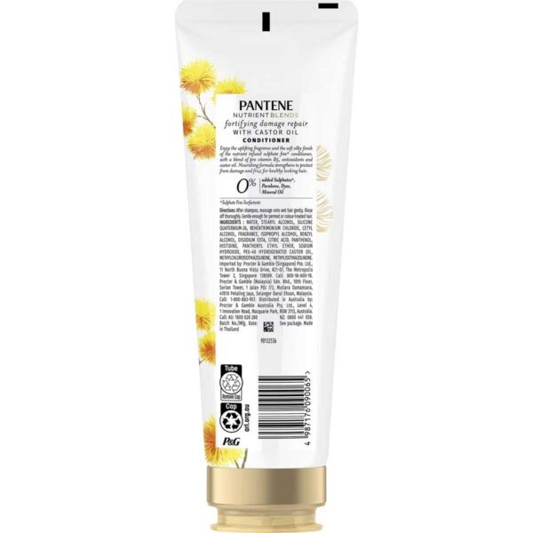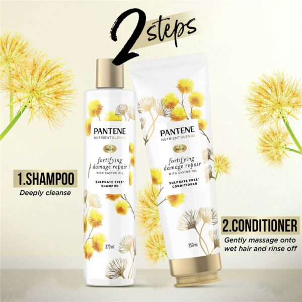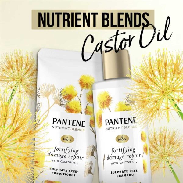 Specially curated with Pro-V Formula & Castor Oil, Pantene Nutrient Blends fortifying damage repair shampoo helps to repair up to 2X** damage repair for strong**, healthy hair! Enjoy the uplifting fragrance and the soft silky finish of the nutrient infused sulphate free+ conditioner, with a blend of pro vitamin B5, antioxidants and castor oil. Nourishing formula strengthens to protect from damage and frizz for healthy looking hair.