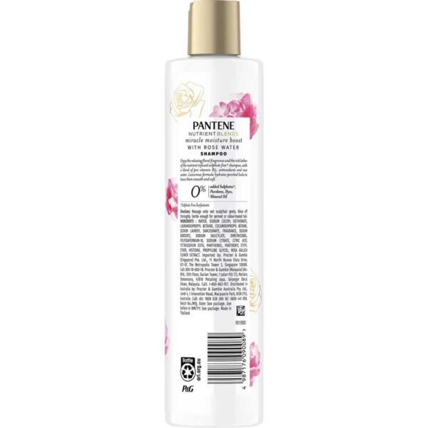 Specially curated with Pro-V Formula & Rosewater, Pantene Nutrient Blends Miracle Moisture Boostshampoo helps to repair up to 2X** damage repair for smoother hair and tames frizz! Enjoy the relaxing floral fragrance and the rich lather of the nutrient infused sulphate free*shampoo, with a blend of pro vitamin B5, antioxidants and rose water. Luxurious formula hydrates parched locks to leave them smooth and soft.