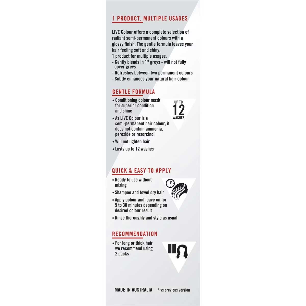 • As LIVE Colour is a semi-permanent hair colour, it does not contain ammonia, peroxide or resorcinol