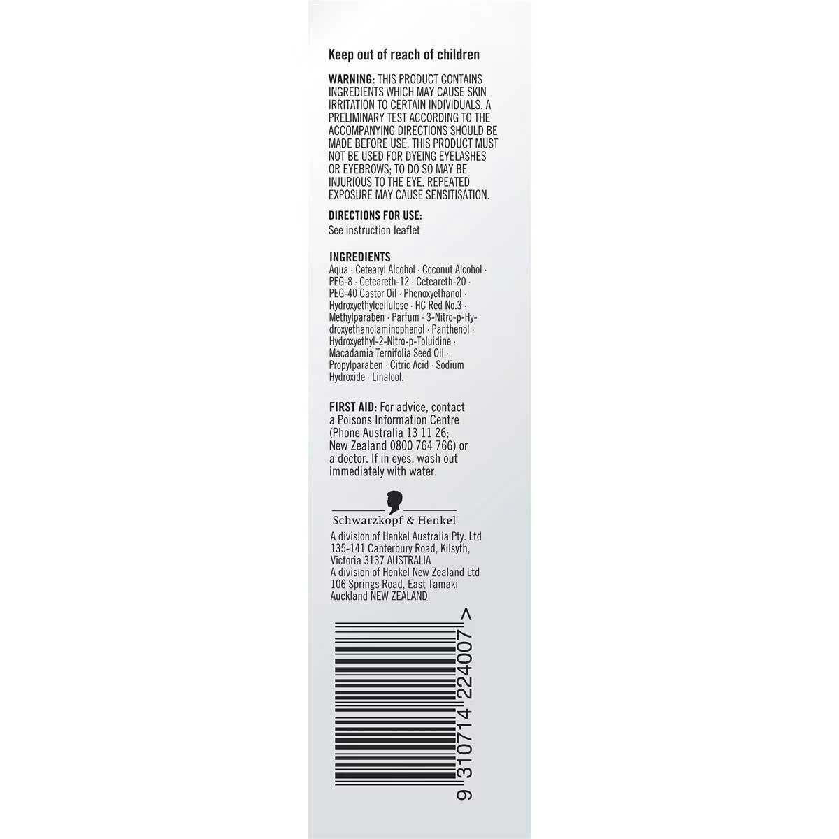 INGREDIENTS: Aqua Cetearyl Alcohol Coconut Alcohol PEG-8 Ceteareth-12 Ceteareth-20 PEG-40 Castor Oil Phenoxyethanol Hydroxyethylcellulose HC Red No.3 Methylparaben Parfum 3-Nitro-p-Hydroxyethanolaminophenol Panthenol Hydroxyethyl-2-Nitro-p-Toluidine Macadamia Ternifolia Seed Oil Propylparaben Citric Acid Sodium Hydroxide Linalool.