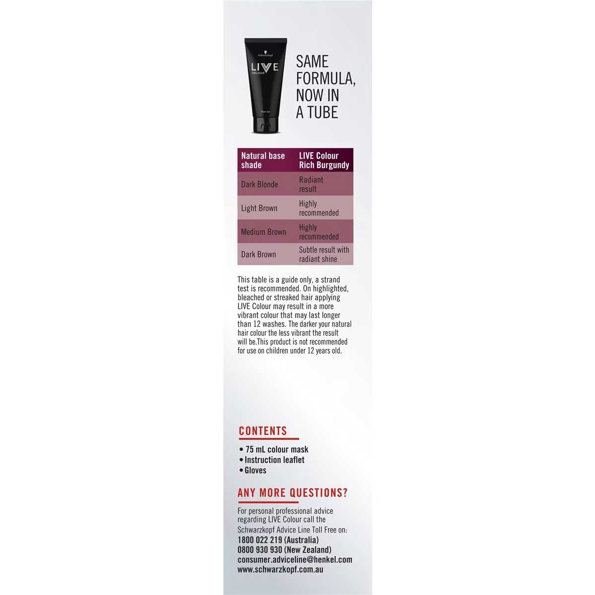 Schwarzkopf LIVE Colour Rich Burgundy 75ml with gentle ammonia-free colour mask for superior condition, shine and rich tones.