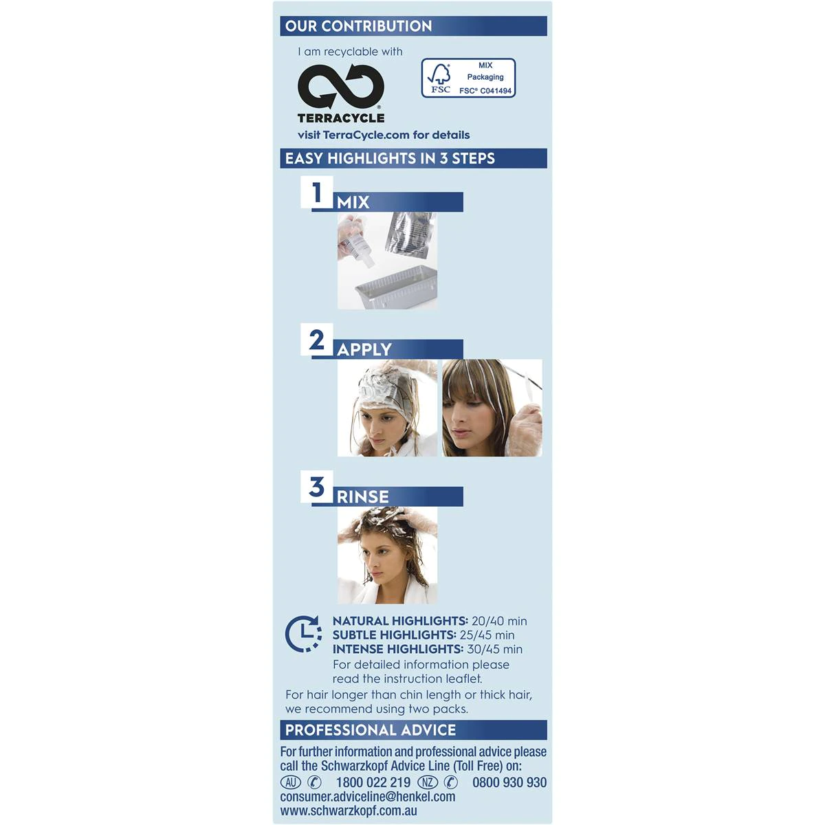 The oil-enriched formula combined with OMEGAPLEX Anti-Breakage Technology delivers up to 80 % less hair breakage* and up to 6 levels of lift. The streaking cap application creates fine defined highlights while the highlighter brush application creates bolder, customised highlights. The conditioning after treatment with anti-yellow effect will leave you with soft, sensational looking blonde hair.