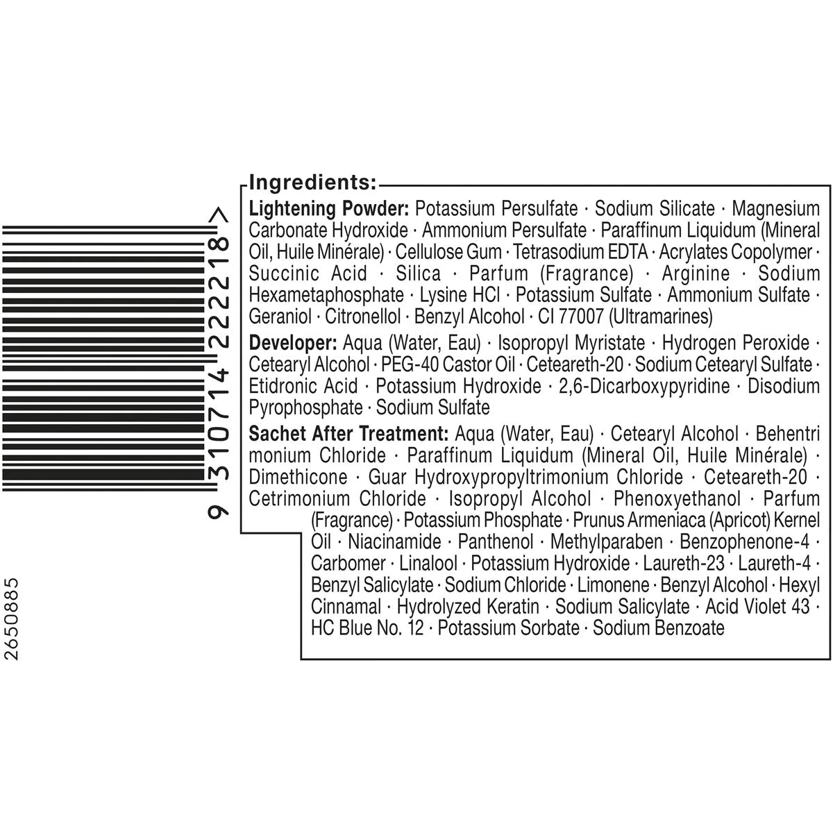 Lightening Powder: Potassium Persulfate · Sodium Silicate · Magnesium Carbonate Hydroxide · Ammonium Persulfate · Paraffinum Liquidum (Mineral Oil, Huile Minérale) · Cellulose Gum · Tetrasodium EDTA · Acrylates Copolymer · Succinic Acid · Silica · Parfum (Fragrance) · Arginine · Sodium Hexametaphosphate · Lysine HCl · Potassium Sulfate · Ammonium Sulfate · Geraniol · Citronellol · Benzyl Alcohol · CI 77007 (Ultramarines) Developer: Aqua (Water, Eau) · Isopropyl Myristate · Hydrogen Peroxide · Cetearyl Alcohol · PEG-40 Castor Oil · Ceteareth-20 · Sodium Cetearyl Sulfate · Etidronic Acid · Potassium Hydroxide · 2,6-Dicarboxypyridine · Disodium Pyrophosphate · Sodium Sulfate Sachet After Treatment: Aqua (Water, Eau) · Cetearyl Alcohol · Behentri monium Chloride · Paraffinum Liquidum (Mineral Oil, Huile Minérale) ·