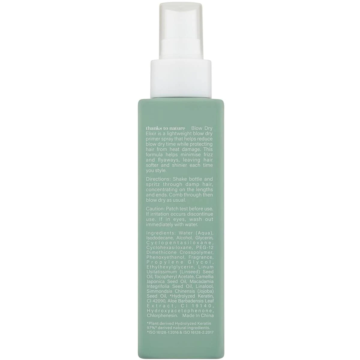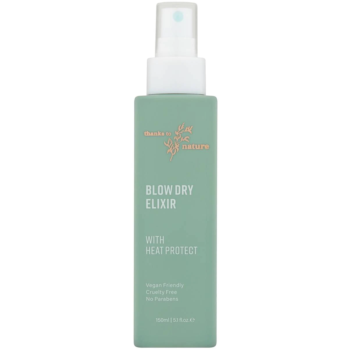 Thanks To Nature Blow Dry Elixir is a lightweight blow dry primer spray that helps reduce blow dry time while protecting hair from heat damage.