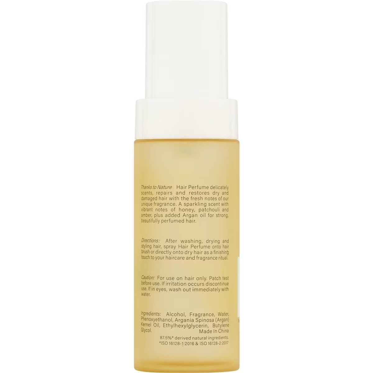 Thanks To Nature Hair Perfume delicately scents and helps to restore dry damaged looking hair with fresh notes of our unique signature fragrance. A sparkling scent with vibrant notes of honey, patchouli and amber, plus added argan oil for shiny, beautifully perfumed hair.