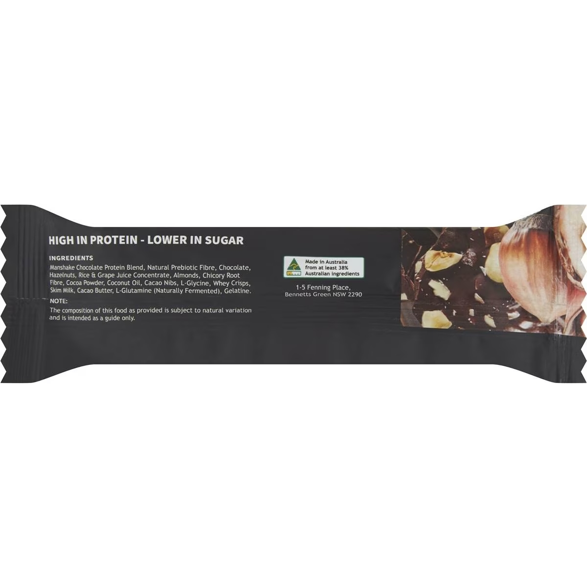 Manshake Chocolate Protein Blend, Natural Prebiotic Fibre, Chocolate, Hazelnuts, Rice & Grape Juice Concentrate, Almonds, Chicory Root Fibre, Cocoa Powder, Coconut Oil, Cacao Nibs, L-Glycine, Whey Crisps, Skim Milk, Cacao Butter, L-Glutamine (Naturally Fermented), Gelatine